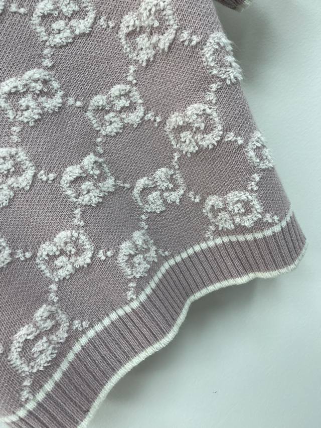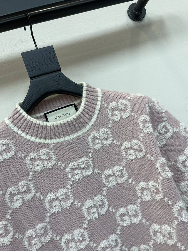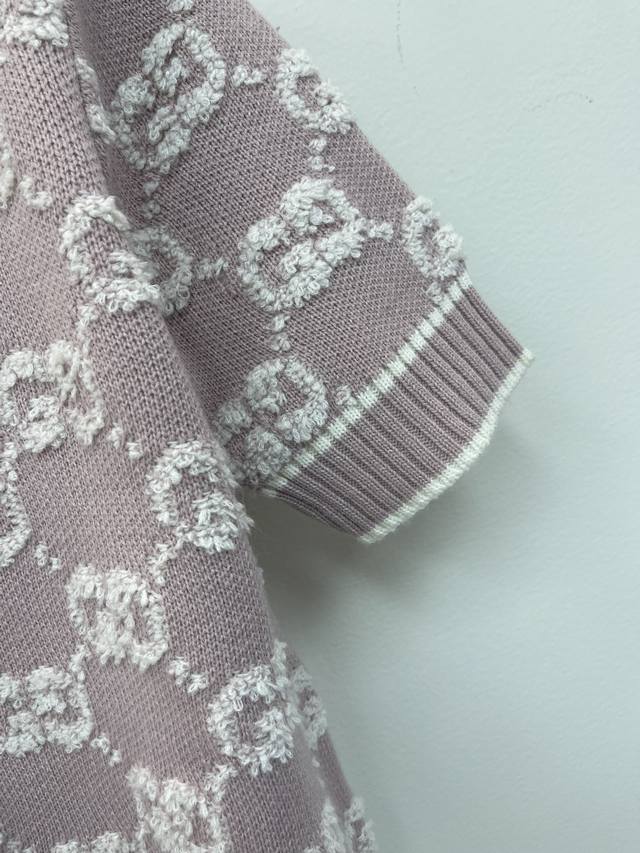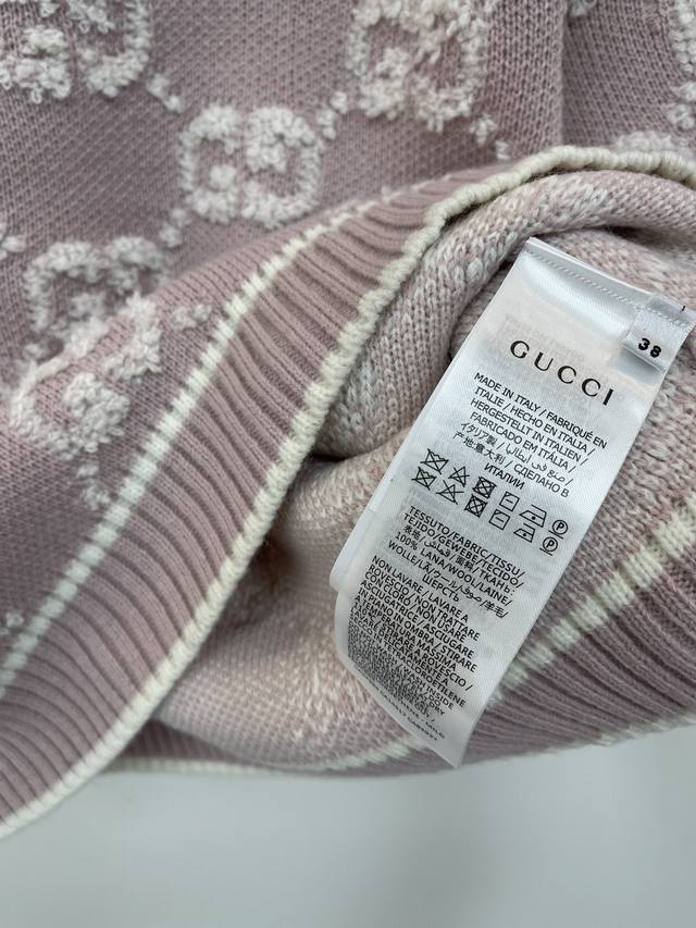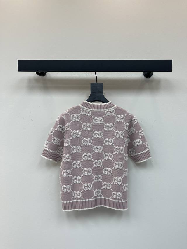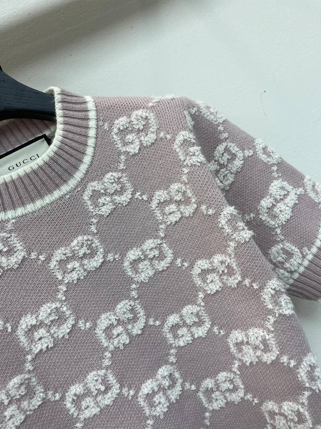 Sakura Pink Full-Mark Knit Short Sleeve Wool Knot Jacquard Top The Gg pattern returns with selected materials and sequins, cleverly paired with gold and silver thread and intricately patterned knotted tweed. This top is made of Gg wool knotted jacquard fabric and is a selected masterpiece in the series. Sml Aa.