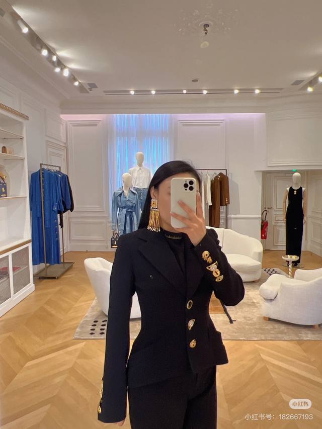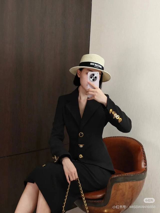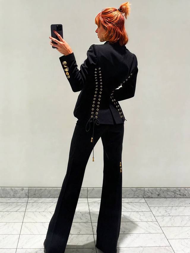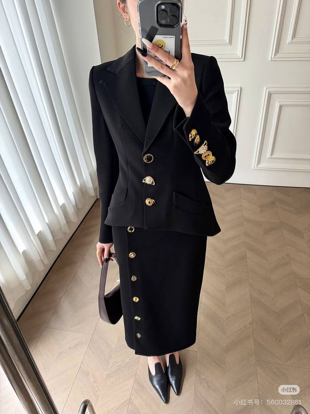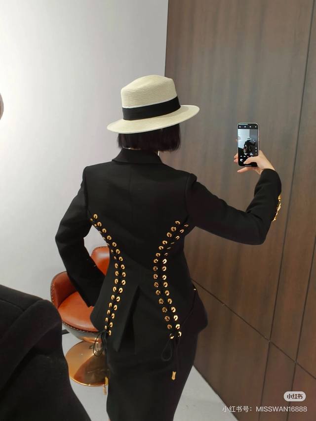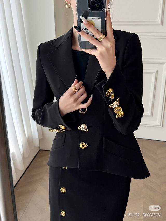 Schiapare*Li New Custom-Made Long-Sleeved Blazer with Various Irregularly Shaped Gold Buttons, Double-Row Perforated Tie-Back Design, Slim Fit and Flattering Lapel! Black, Size M: Shoulder Width 39cm (with shoulder pads), Chest 90cm, Sleeve Length 62cm, Length 56cm.