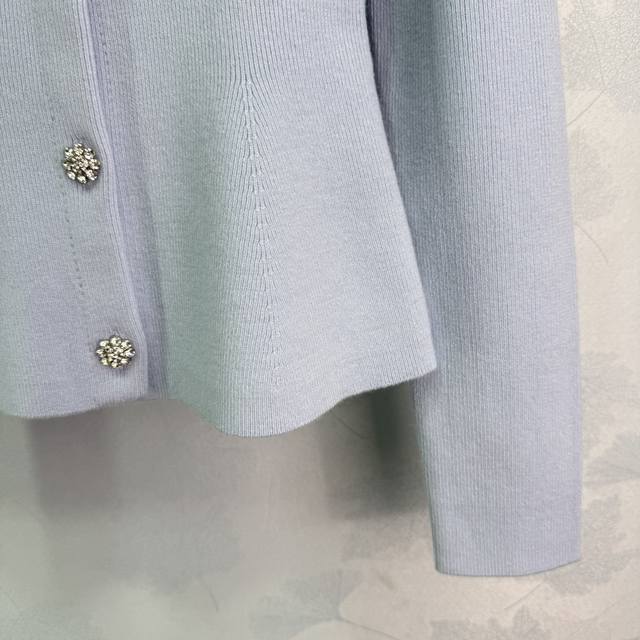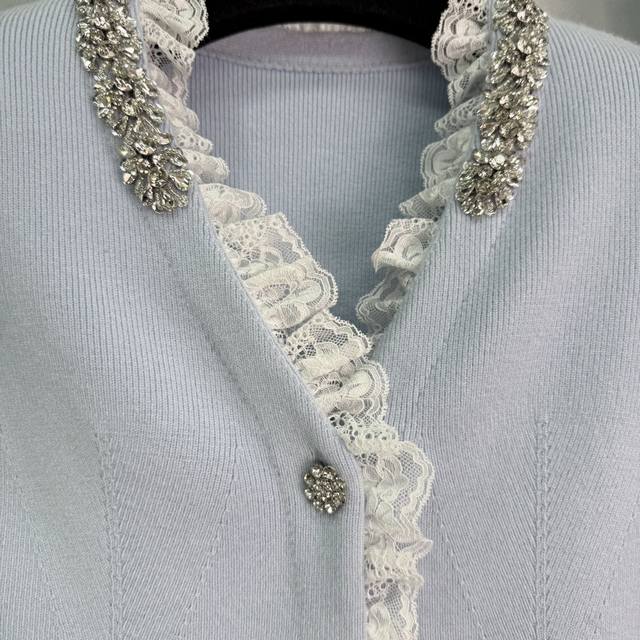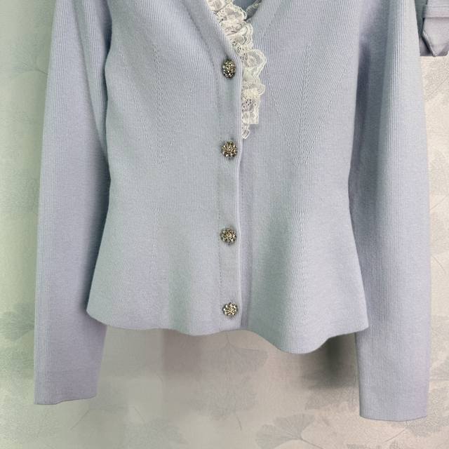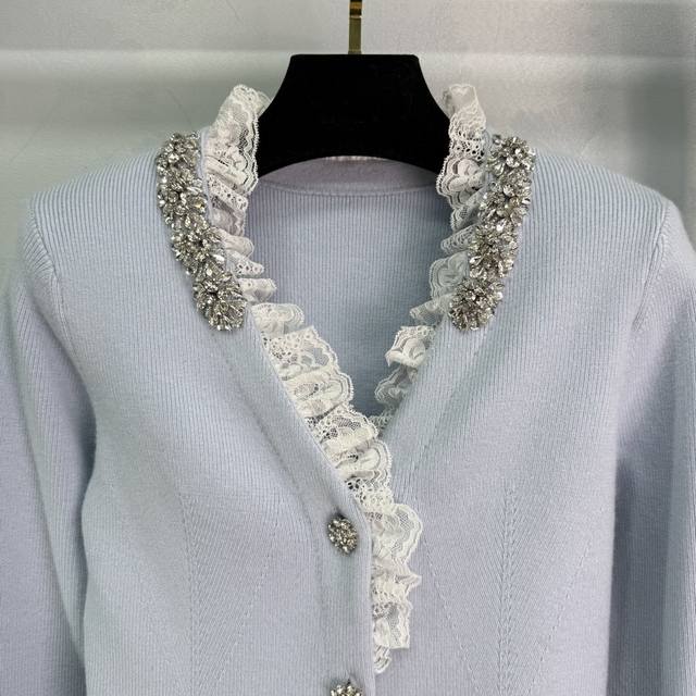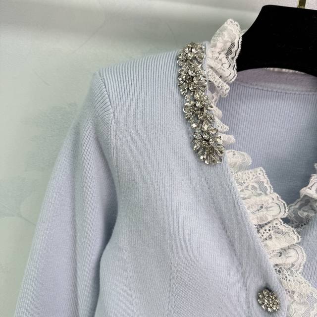 Se*2025 Autumn/Winter New Light Blue V-Neck Knit Cardigan with Lace Trim and Crystal Embellishments. Exquisite and Elegant Wool Blend Fabric, Slim Fit, French Romantic Style! 1 Color, 3 Sizes: S, M, L, DDD
