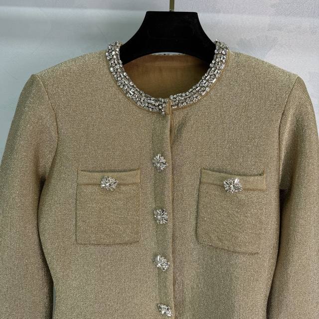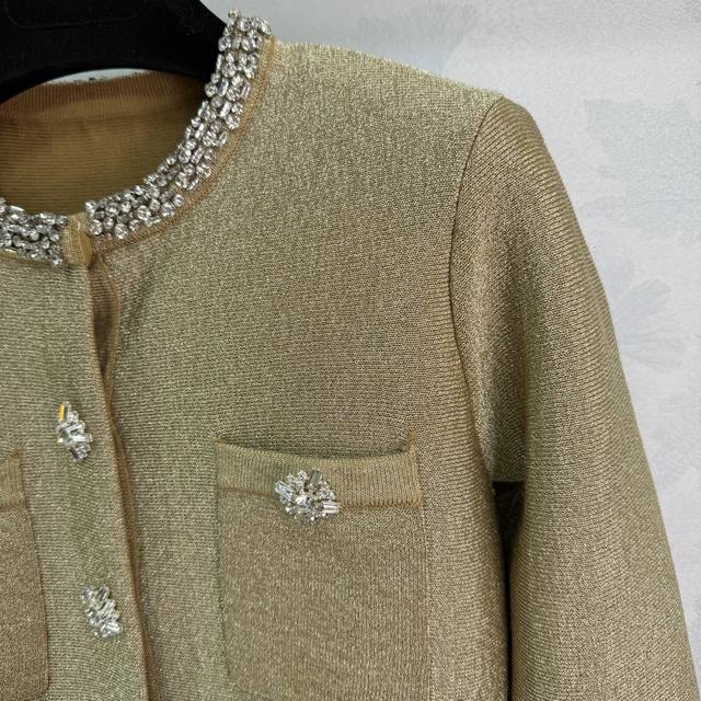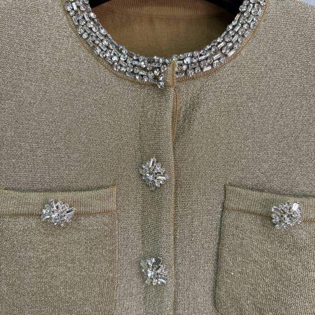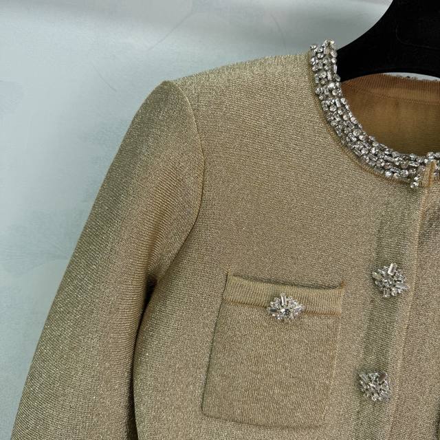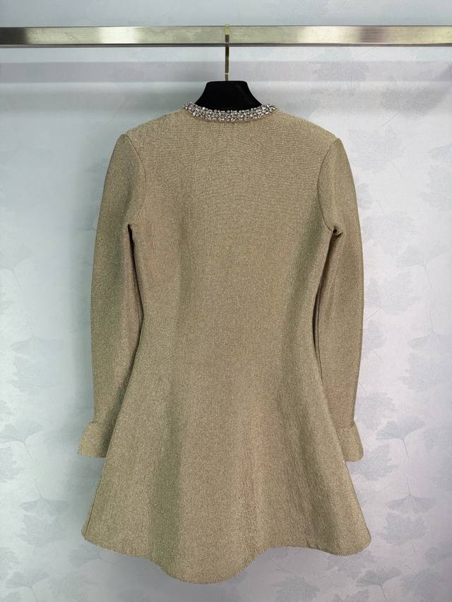 Se*26 Early Spring Collection Gold-Plated Chanel-Style Dress. Made of champagne gold shimmering knit fabric, soft and lustrous, perfect for autumn and winter. Features a round neck adorned with pearls and rhinestones, metal buttons, and rhinestone pocket embellishments