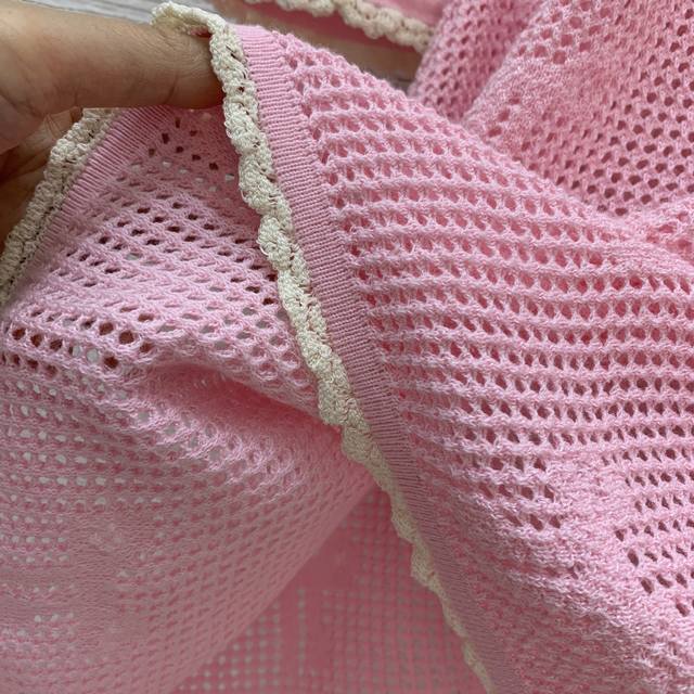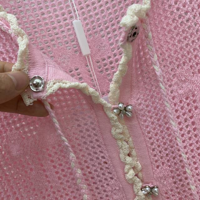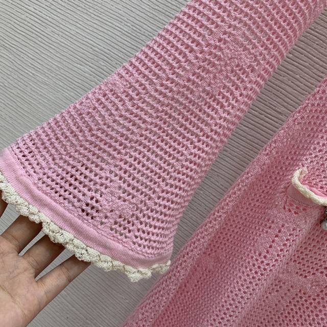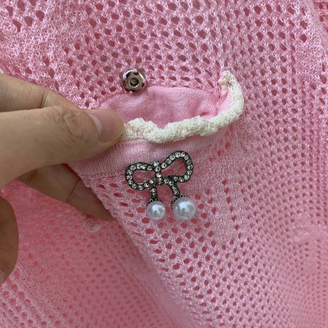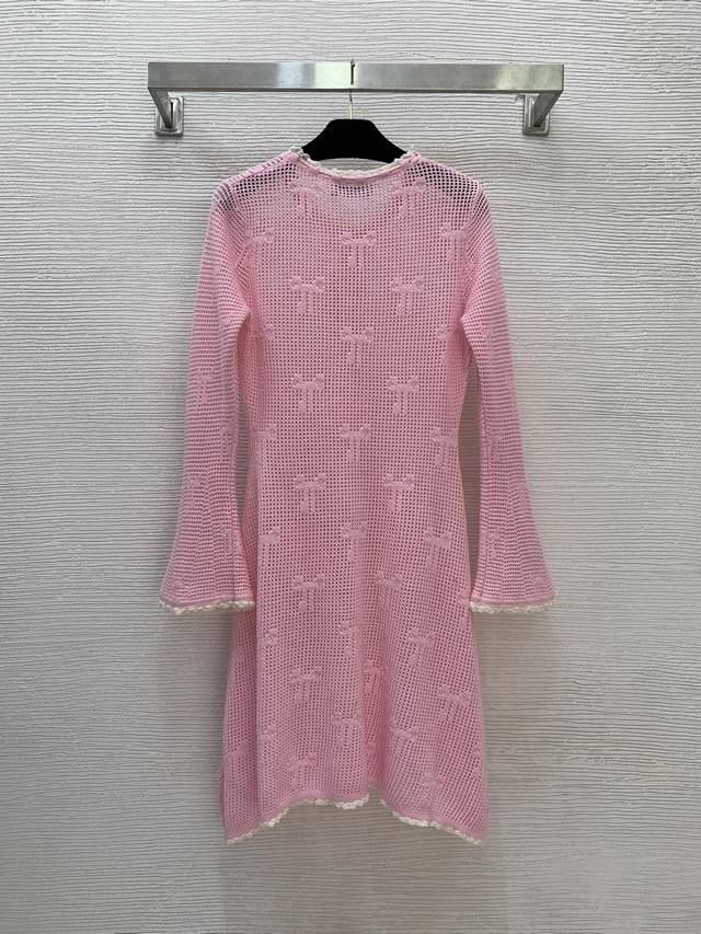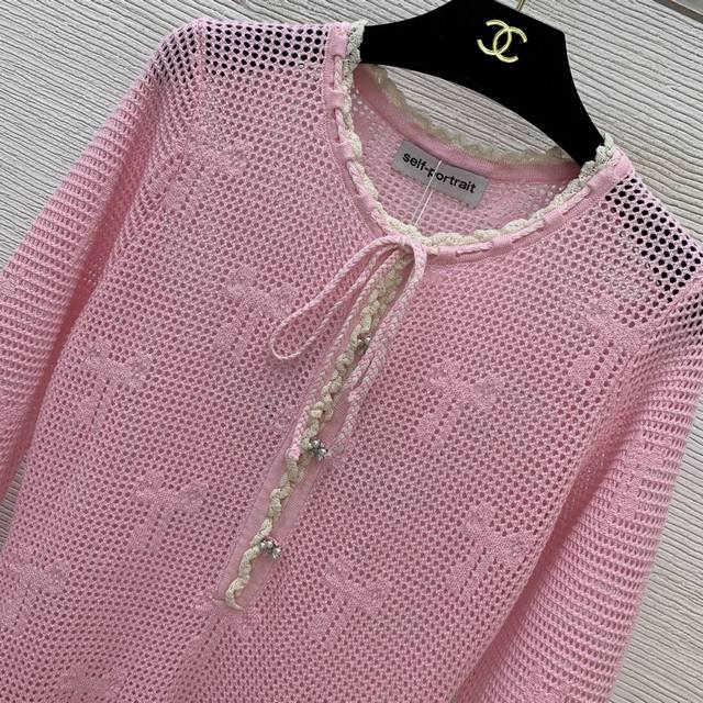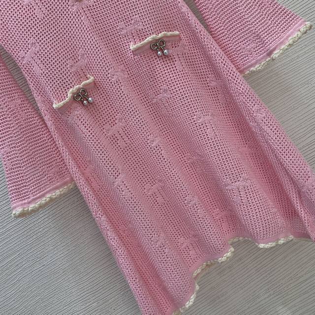 Self-portrai* New Sp home style sweet bow hollow see-through mesh knit fabric, diamond flower button fastening placket round neck slim fit flared sleeve dress! Pink, size M: shoulder width 36, chest 82-86, waist 66-70, sleeve length 58, skirt length 93