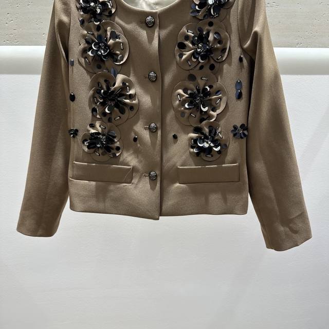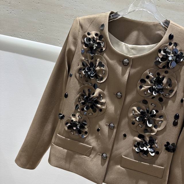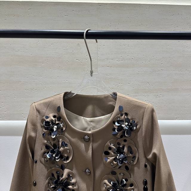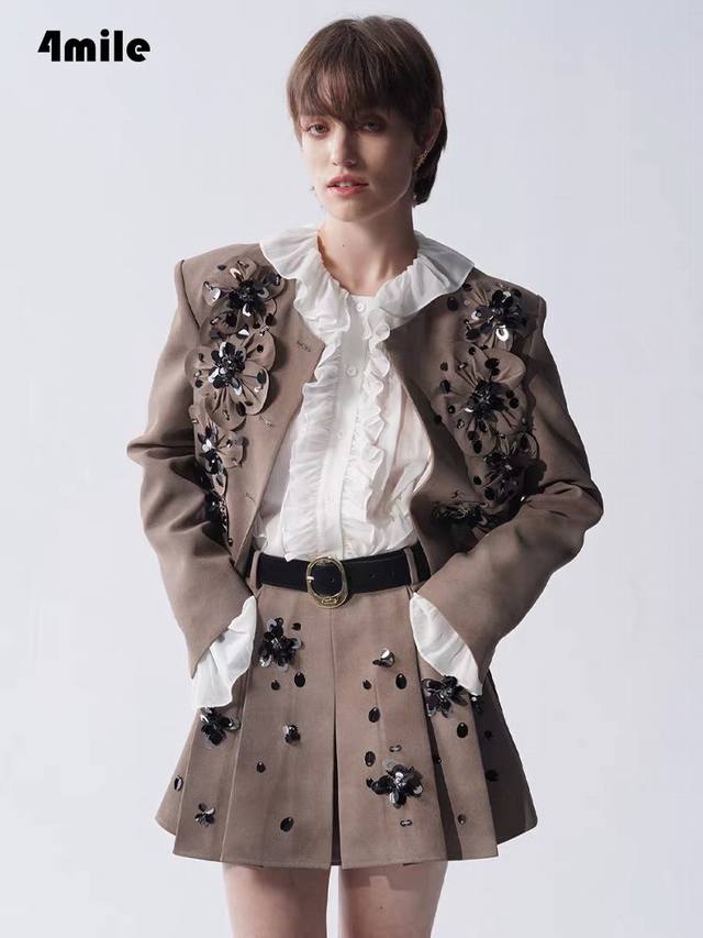 Autumn/Winter Khaki Beaded Sequin Set, including a round-neck cropped jacket and an A-line skirt. Both the jacket and skirt are adorned with three-dimensional flower beading and sequin embellishments, embellished with black diamond-like details, exquisite and eye-catching; the jacket features metal buttons and faux pockets, with a clean cut; the skirt has a pleated cut, lively and energetic; the combination of three-dimensional flower beading and sequins is luxurious and makes you the center of attention. The cropped jacket and A-line skirt optimize body proportions, making you look taller and hiding any unwanted curves. The basic khaki color is suitable for various occasions, including everyday wear, dates, and casual social events. Smlxl