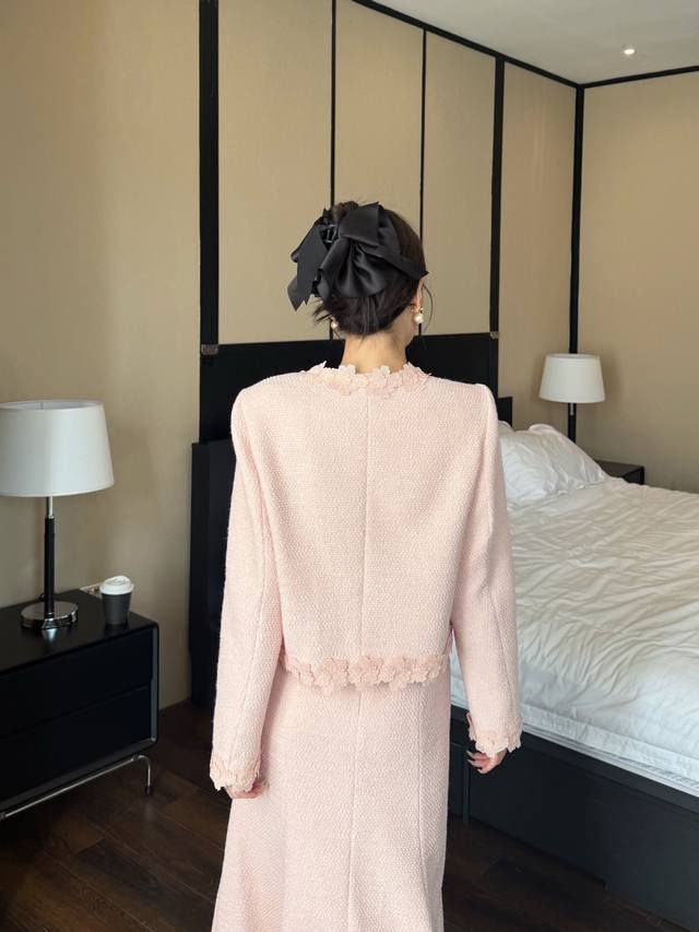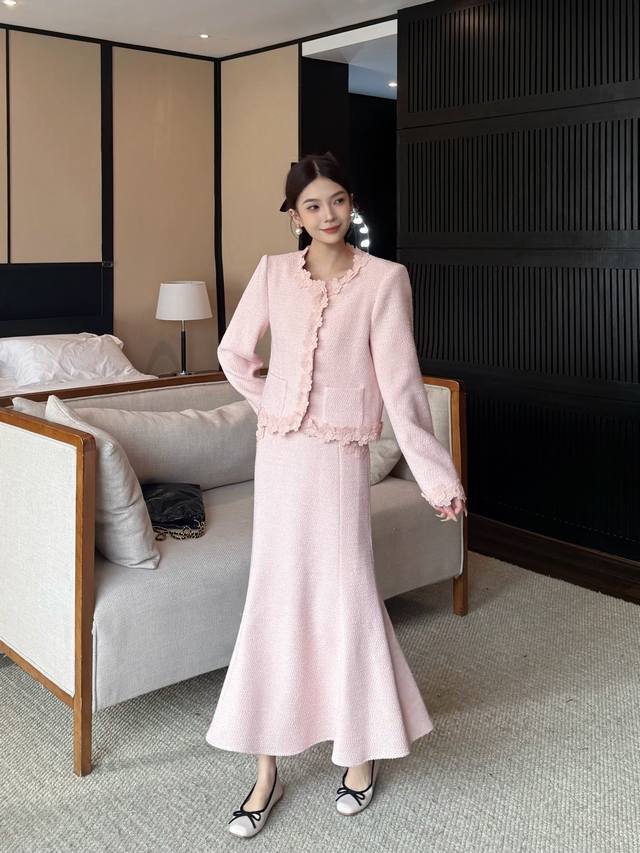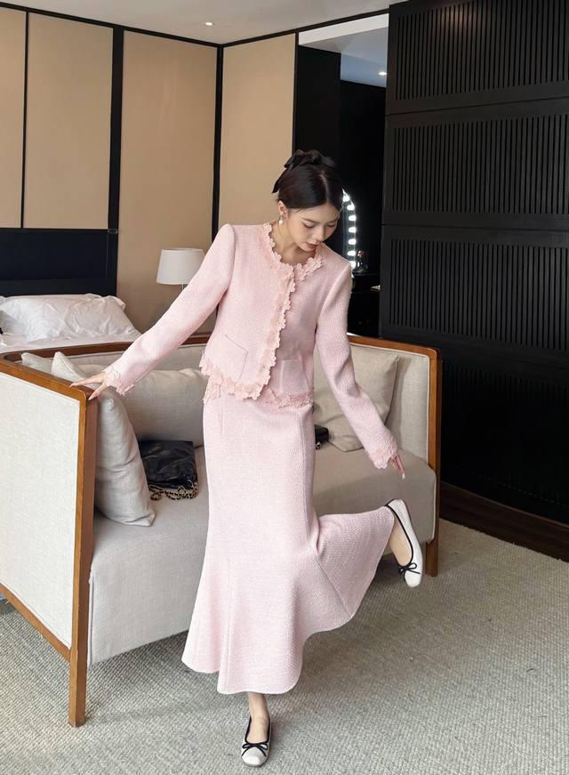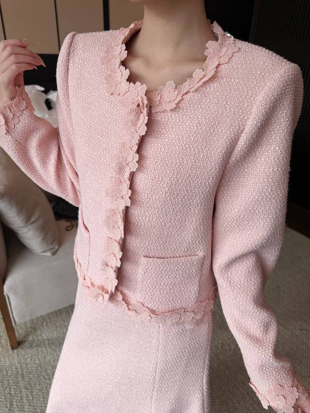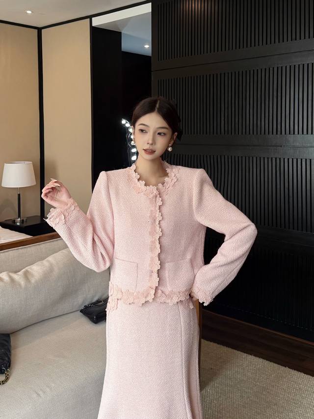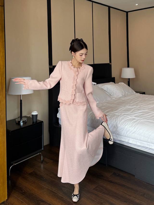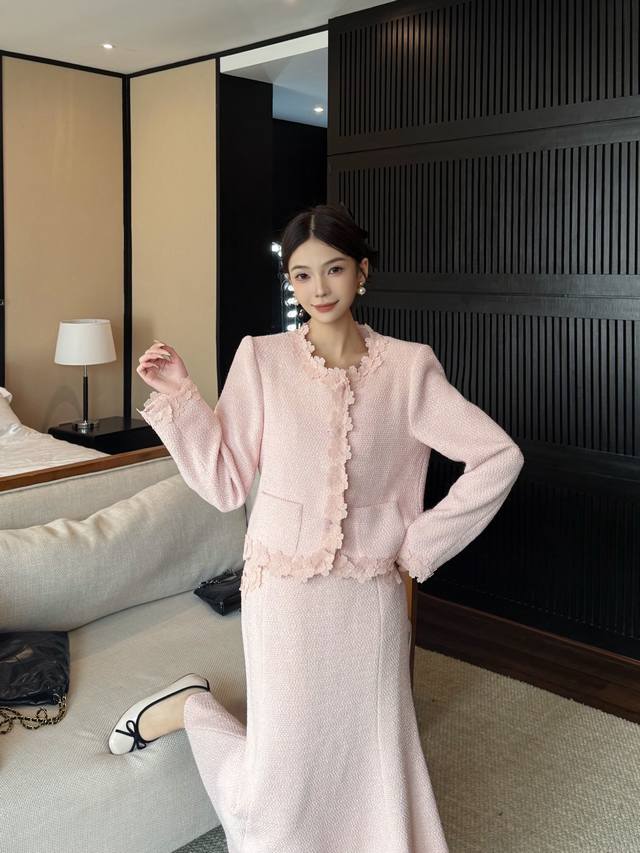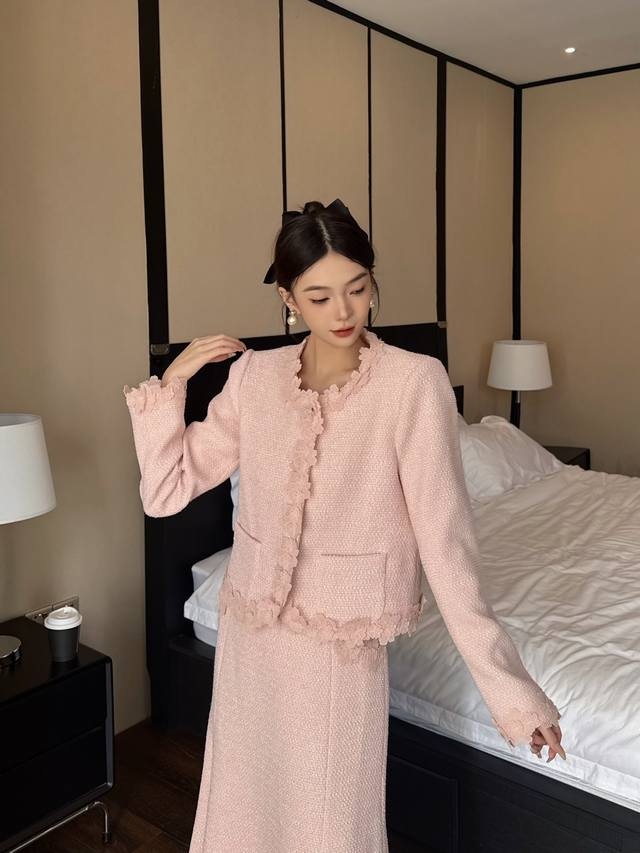 Autumn/Winter New Arrival: Tweed Short Jacket + Skirt Combination. The collar, placket, hem, and cuffs are adorned with petal lace, and the skirt also features lace embellishments. The light brown tone is gentle and elegant. The lace trim adds a touch of femininity. This set is easy to match and the tweed fabric is crisp and textured. Suitable for commuting, dates, and other occasions. Available in brown and pink. Smlxl