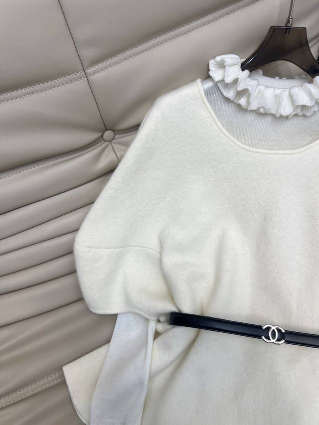 2620 Autumn/Winter Newest Wool Set is Now Available! Base Layer Top Round Neck Lantern Sleeve Loose Fit Long Slit Skirt Three-Piece Set with Ruffled Collar Design Special Style Korean Sweet Style Paired with Chanel Belt for a Slimming Effect In Stock, Can Be Ordered Separately in 3 Colors S, M, L.