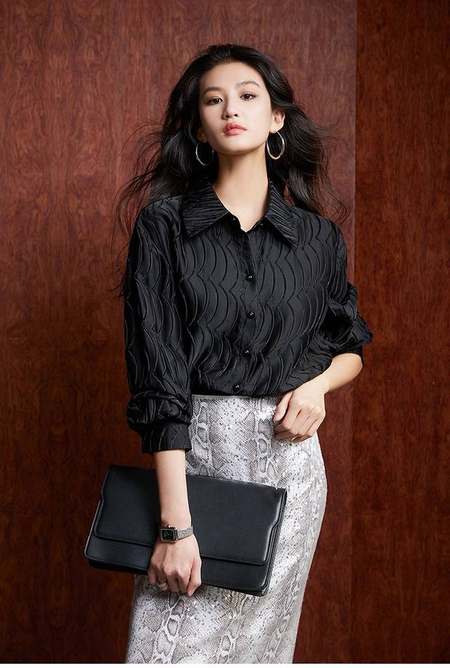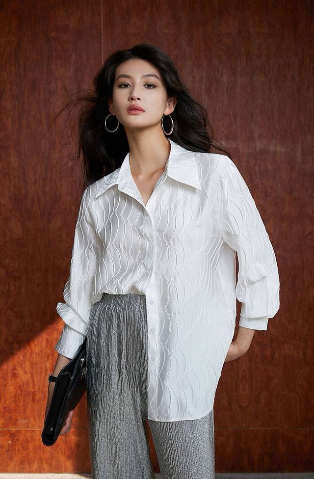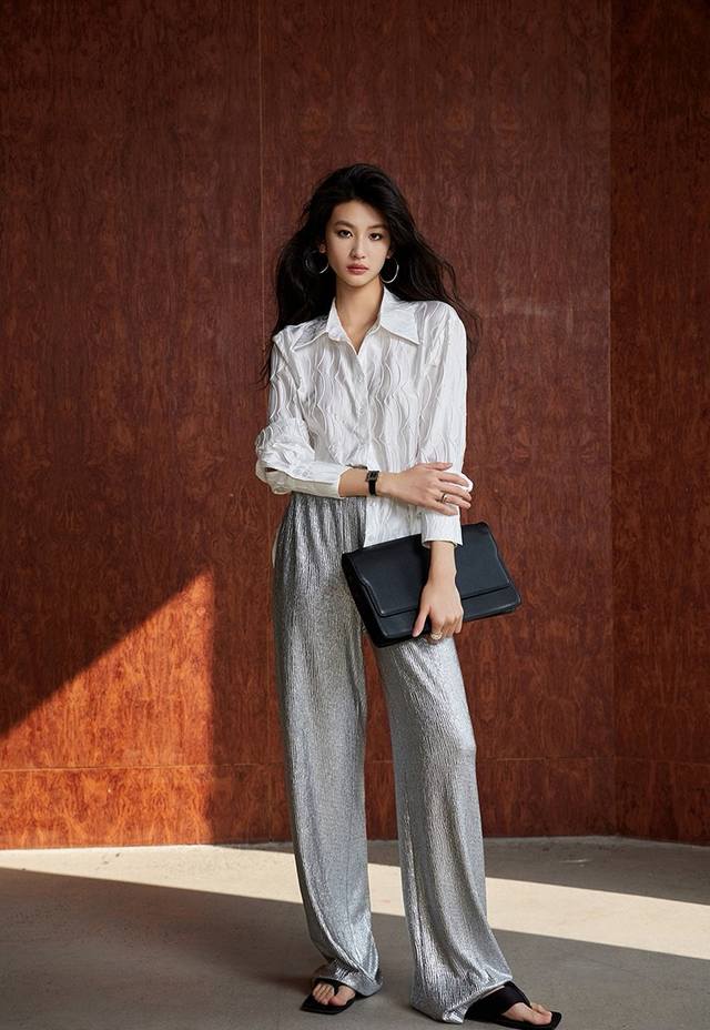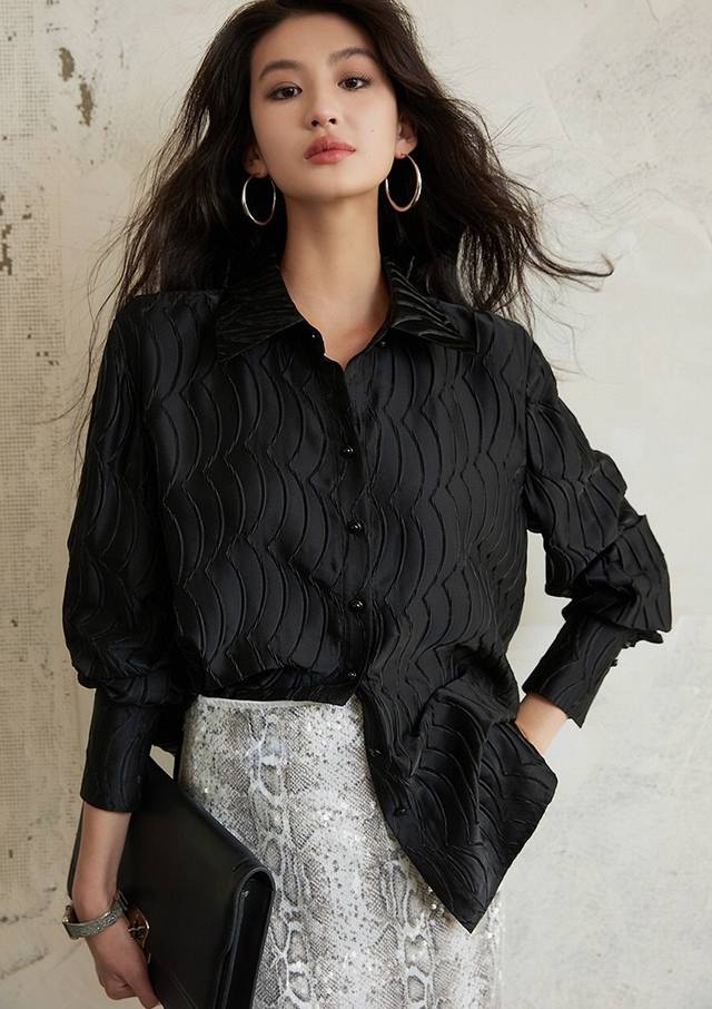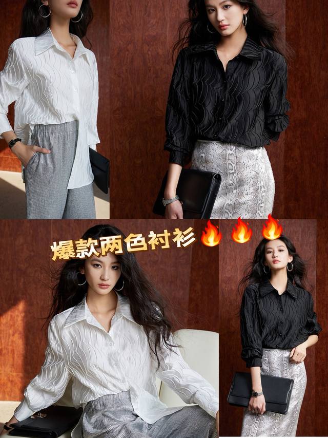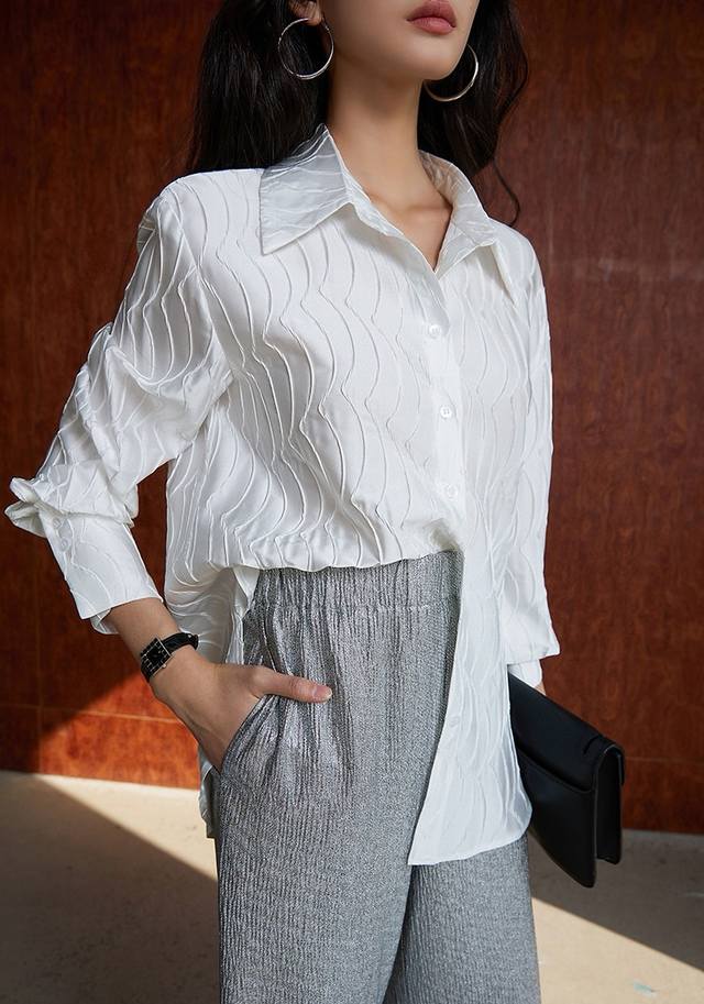 Shipping! High-grade mercerized satin texture, slimming and concealing flesh! حThree-dimensional water ripple wrinkled texture loose lapel long-sleeved two-tone shirt