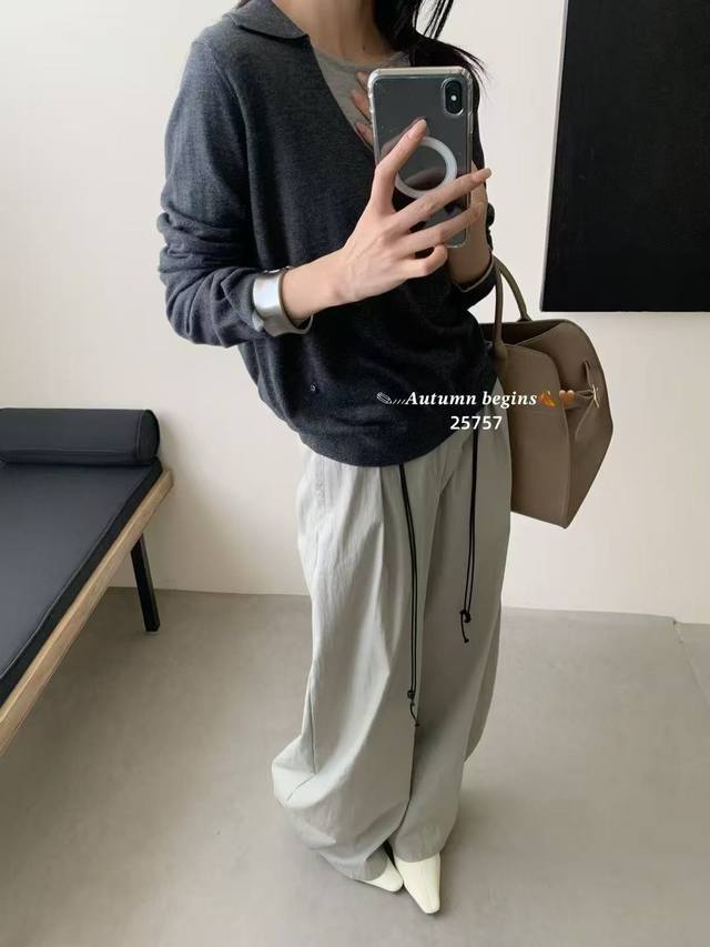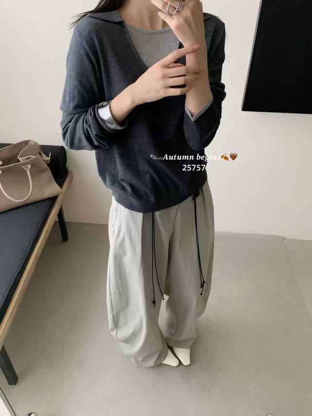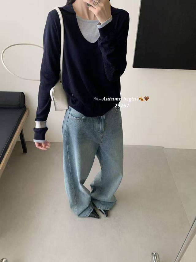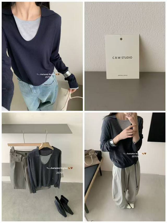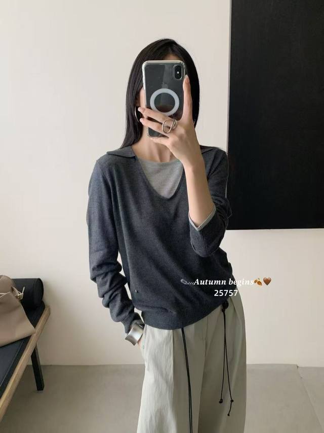 Simple high-end fake two-piece lapel sweater 25 loose slim versatile top fine wo