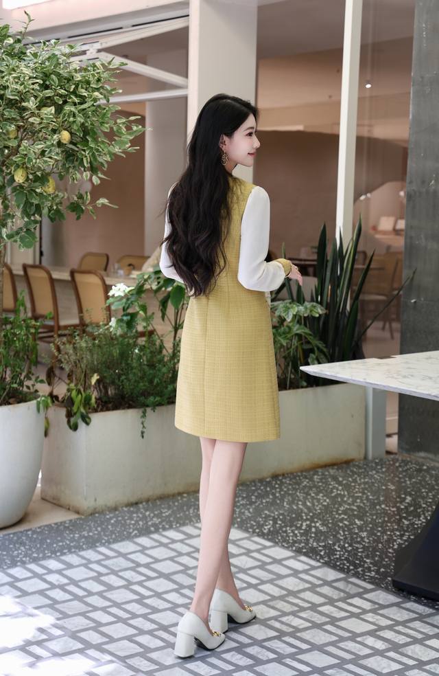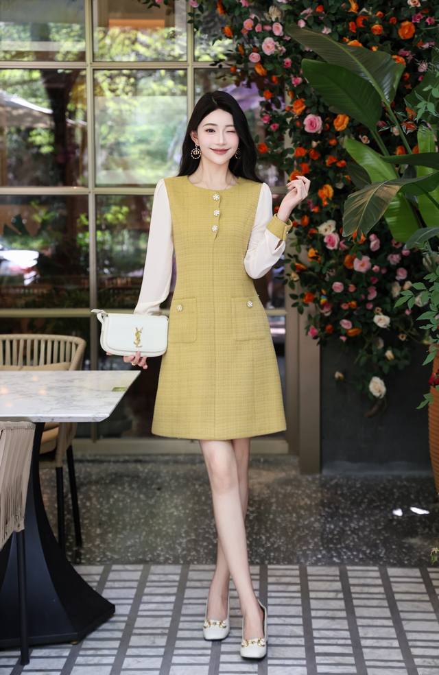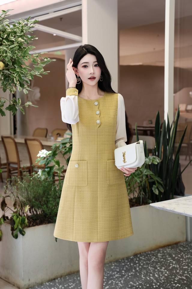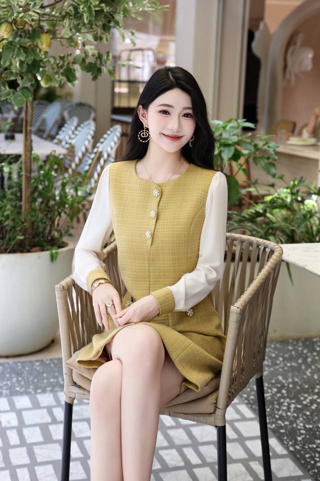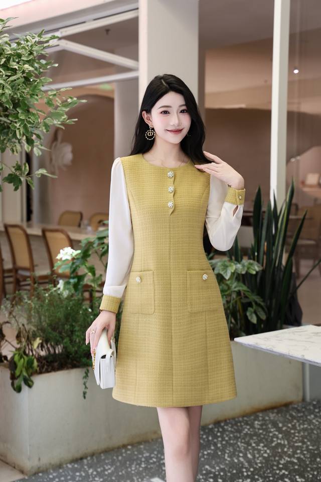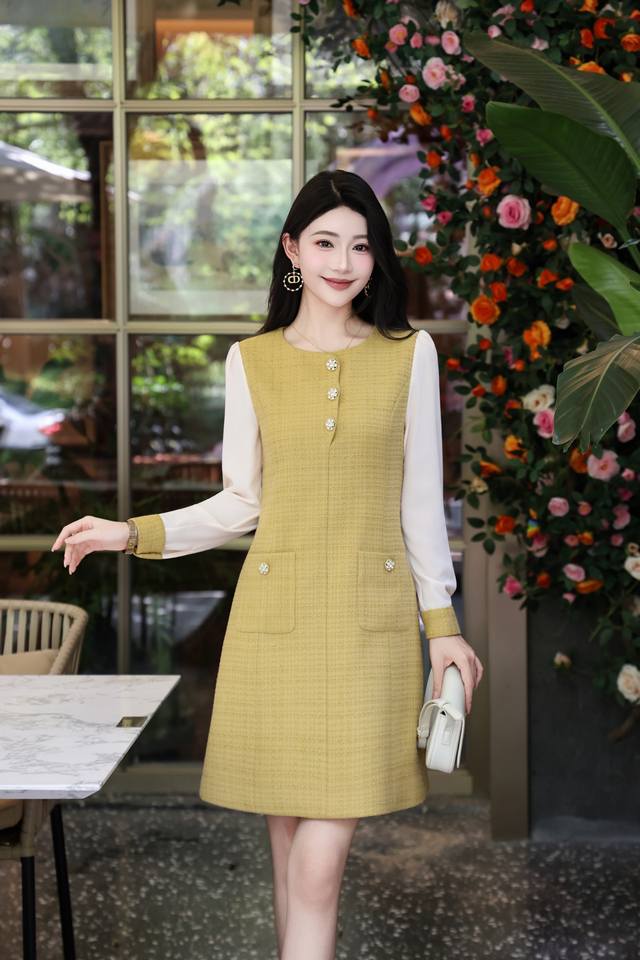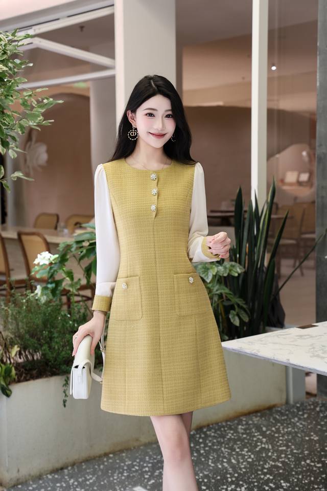 Simple long-sleeved dress with a small fragrance style, sweet and age-reducing, high-end quality, simple and elegant, with a great shape. Black, yellow Smlxlxxl