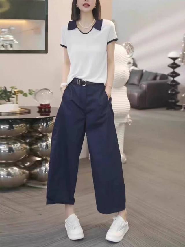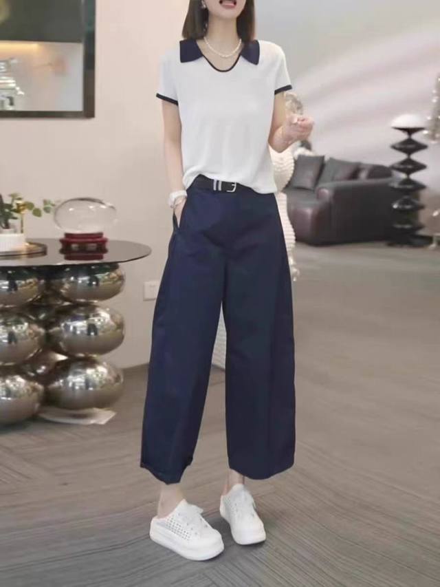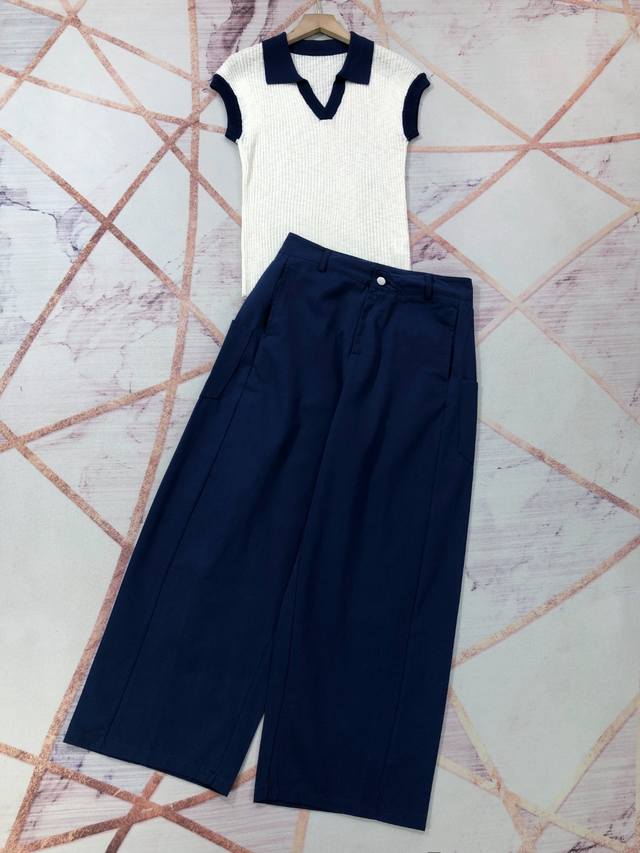 The top is knitted with contrasting colors and short sleeves, and the knitting method makes it look special