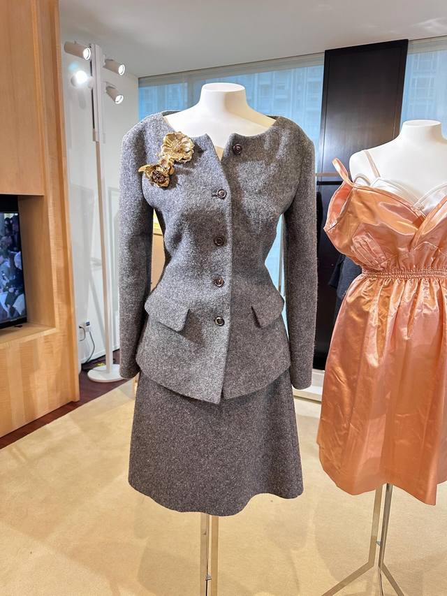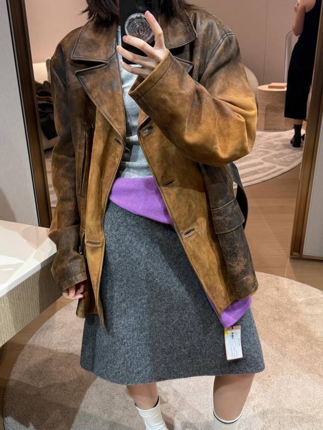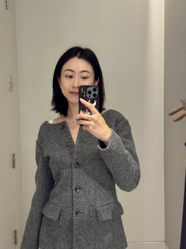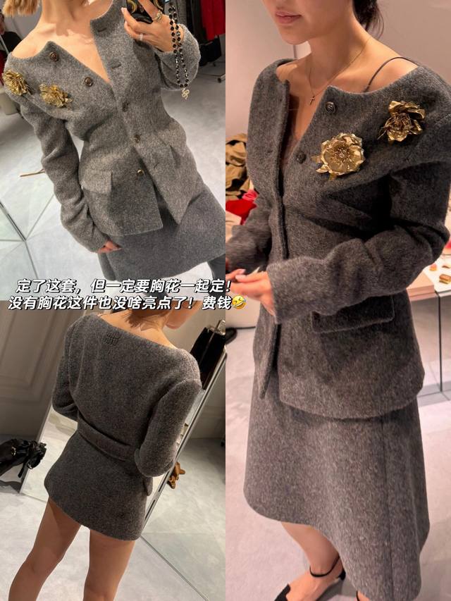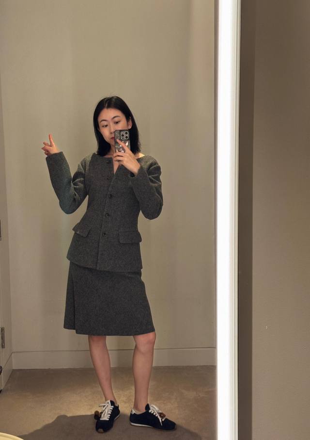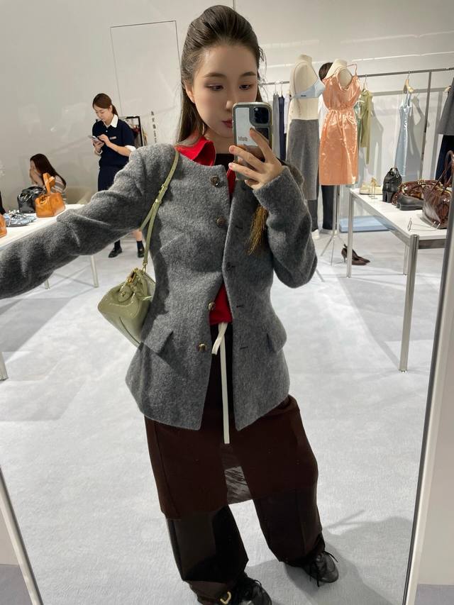 Jacket Miumi* 25Fw New Autumn/Winter Grey Waisted Wool Tweed Jacket + Skirt Set | Exclusive Yb Development! High-quality product! Made of premium wool fabric, the grey grey color has a retro filter. The round neck jacket with a waistline and retro puff sleeves replicate the romance of a French girl. The waistline precisely outlines the waist curve, perfectly blending retro elegance with girlish cuteness. The buttons are arranged in an asymmetrical placket, breaking the conventional design details. The skirt is a knee-length A-line version. The same fabric and color scheme as the top enhances the overall sense of the set. The slightly flared curve of the skirt while walking injects a lively atmosphere into the retro style. Available now SML