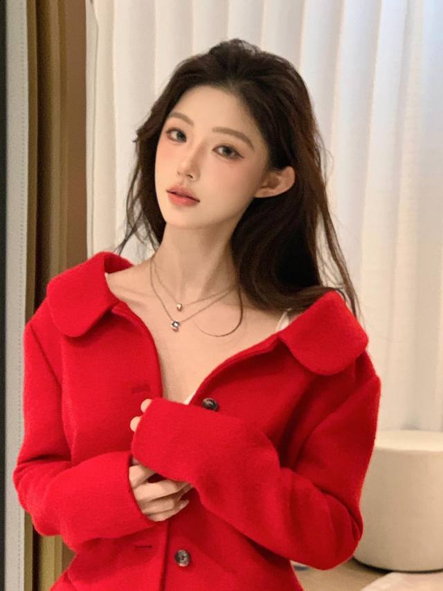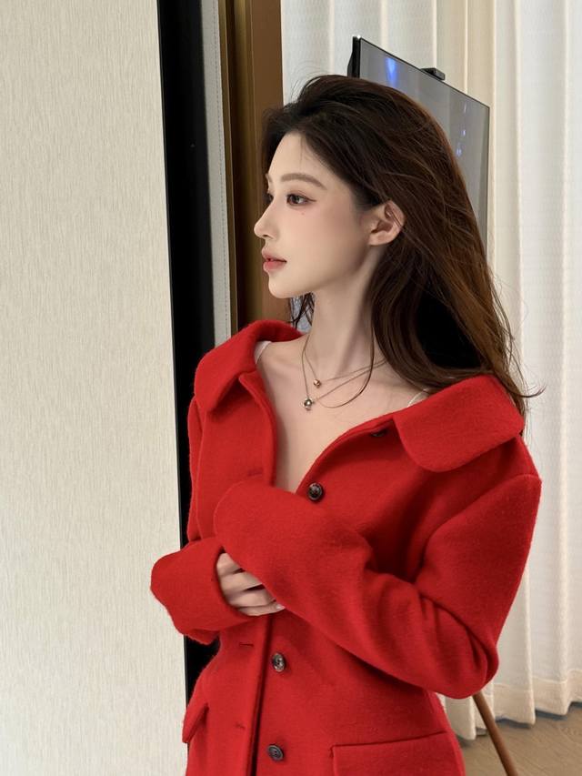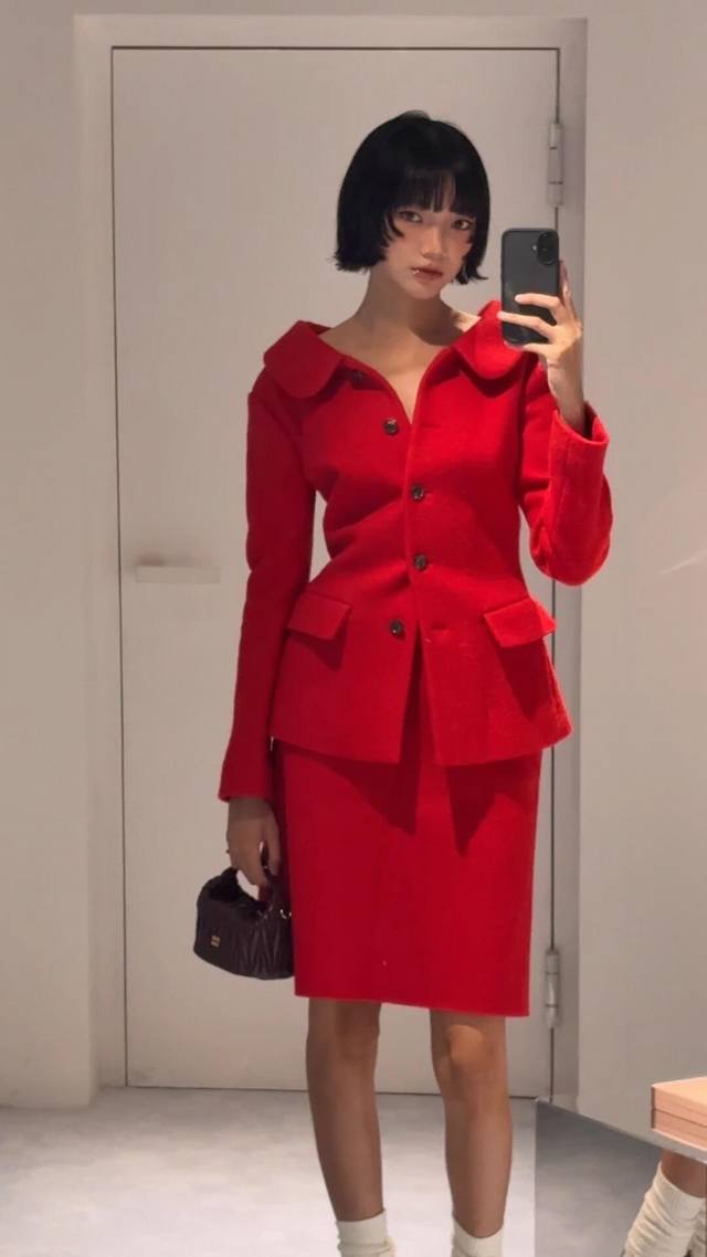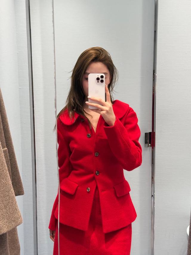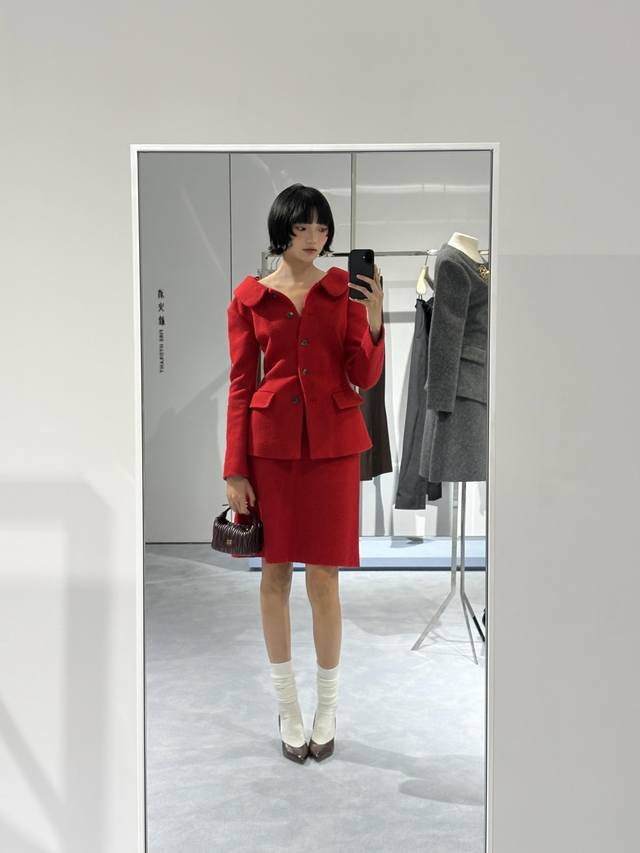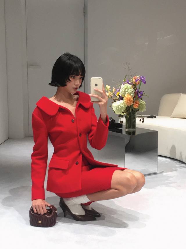 Jacket Miumi* 25Fw New Fall/Winter Red Wool Retro Suit + Skirt Set | Exclusive Yb Development! High-quality product! Made from premium wool fabric, the vibrant red hue is eye-catching. The large lapel design is both playful and retro. The button arrangement on the single-sided slant lapel breaks the conventional symmetry, injecting a Miu-style rebelliousness into the classic silhouette. The waist-hugging tailoring precisely outlines the waistline, and the retro silhouette of the side pockets is an exquisite tribute to vintage style. The skirt is a slim-fitting mid-length, and the combination of the same fabric and color as the top enhances the overall look of the suit. The drape curve when walking adds a touch of feminine charm to the retro style. Available now SML