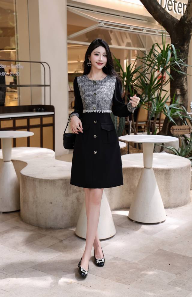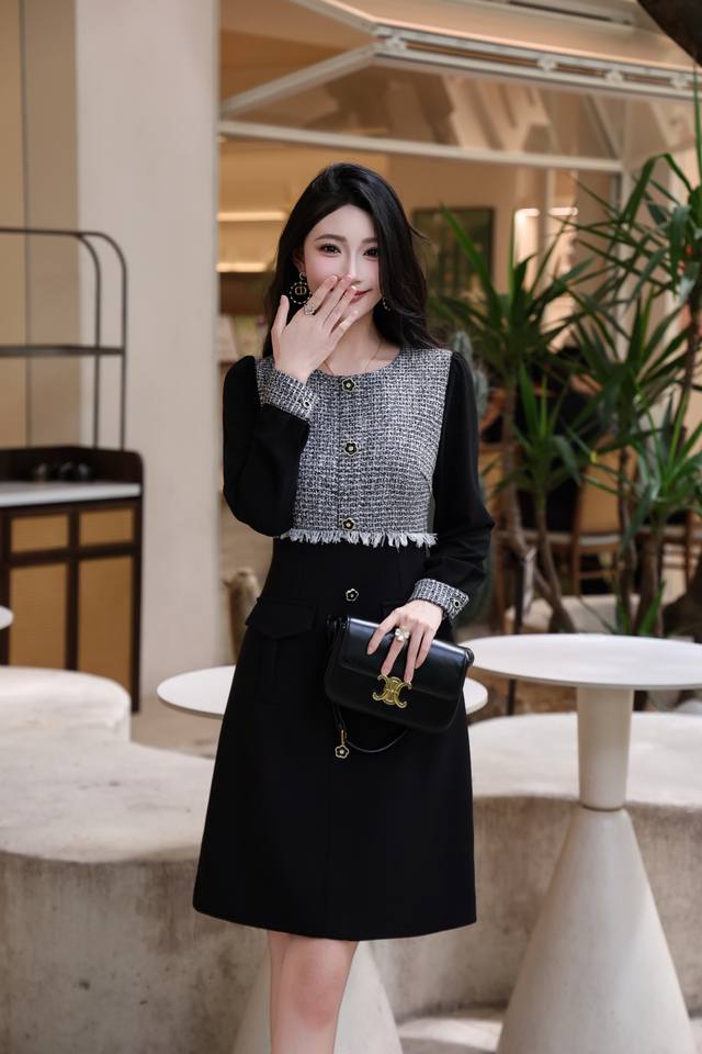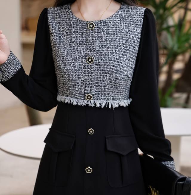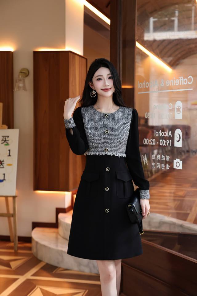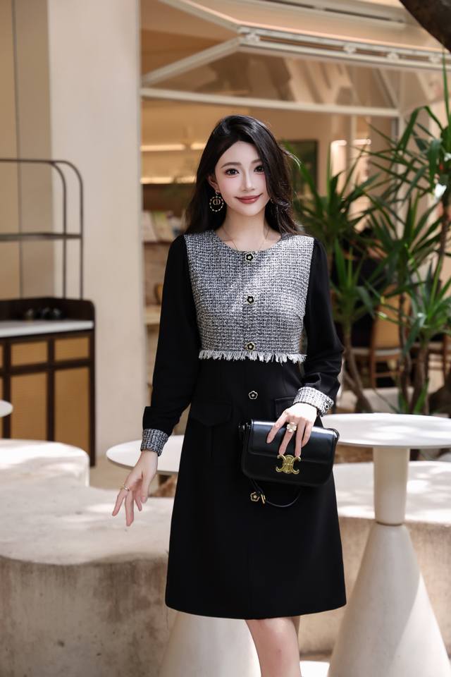 Small Chanel style splicing tassel long-sleeved dress, sweet and age-reducing, high-end quality, simple and elegant, with a great shape. Black, off-white Smlxlxxl