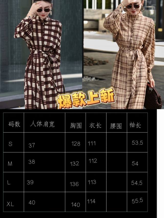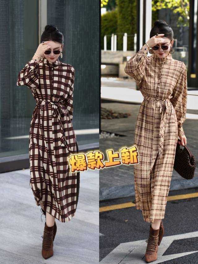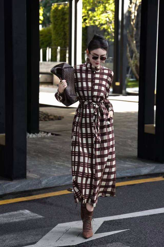Stand-up collar irregular plaid design linen dress versatile fashion loose version tie waist two-color four sizes Smlxl