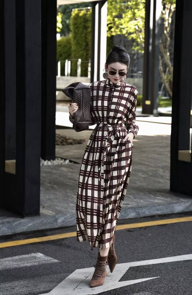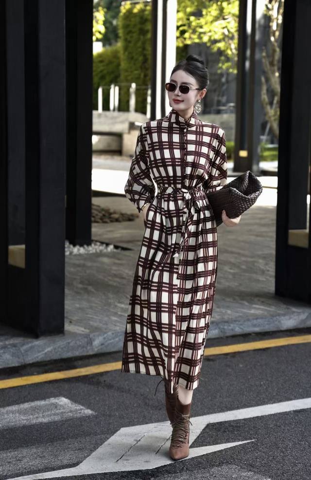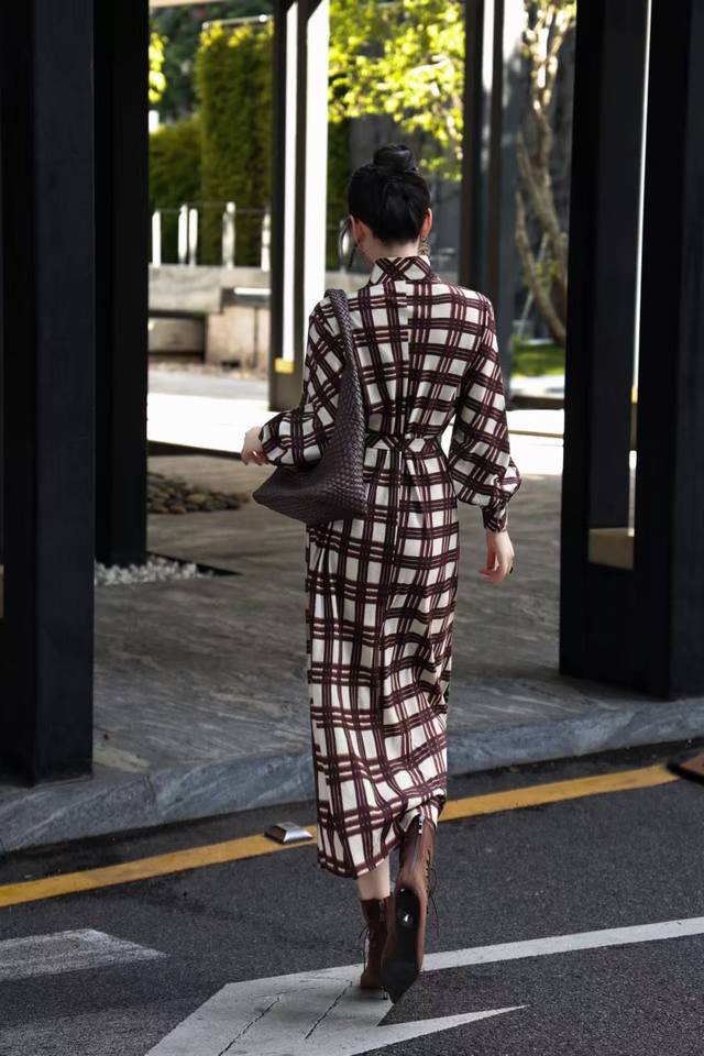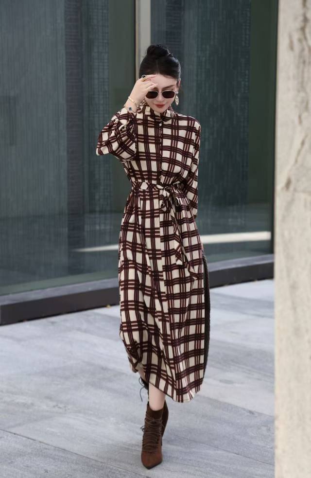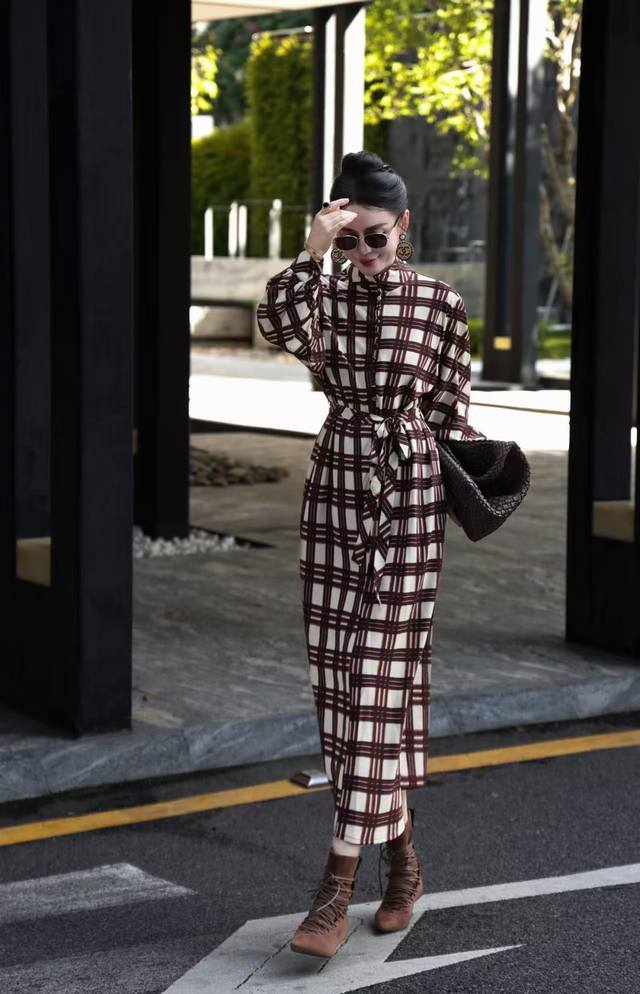 / Stand-up collar irregular plaid design linen dress versatile fashion loose vers