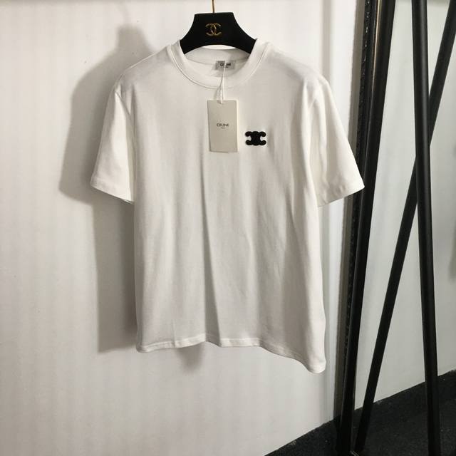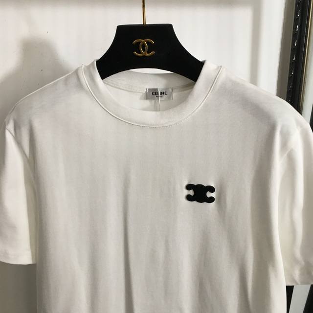 Style No. 1386 Celin* new Arc de Triomphe Logo embroidered cotton short-sleeved T-shirt, white, black, S-Xl, L size; shoulder width 43, chest 106, sleeve length 21, length 65