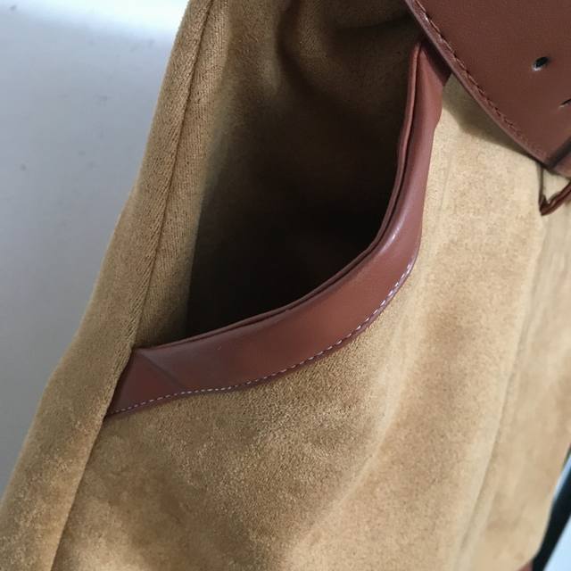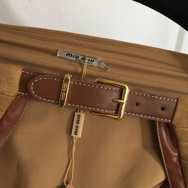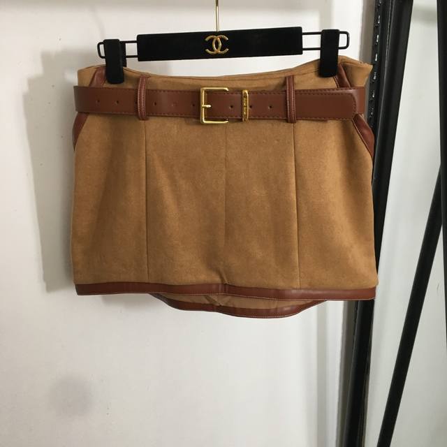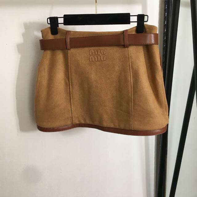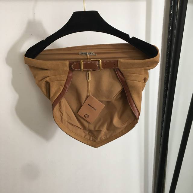Style No. 20252364 Miumi* new deerskin suit, Logo embroidered patch tube top vest + patchwork leather hem short skirt, with belt, brown, Sml, M size; waist 78, length 33