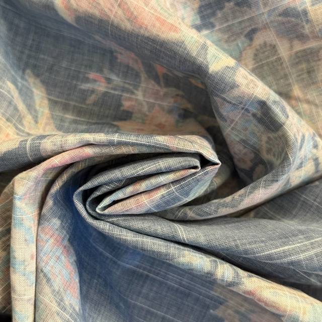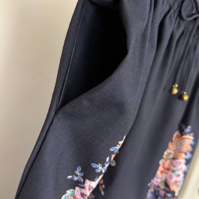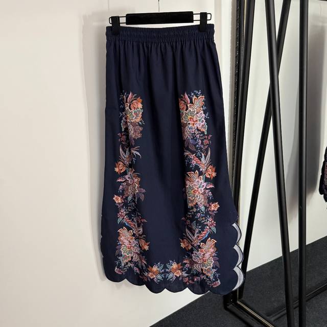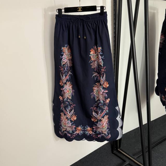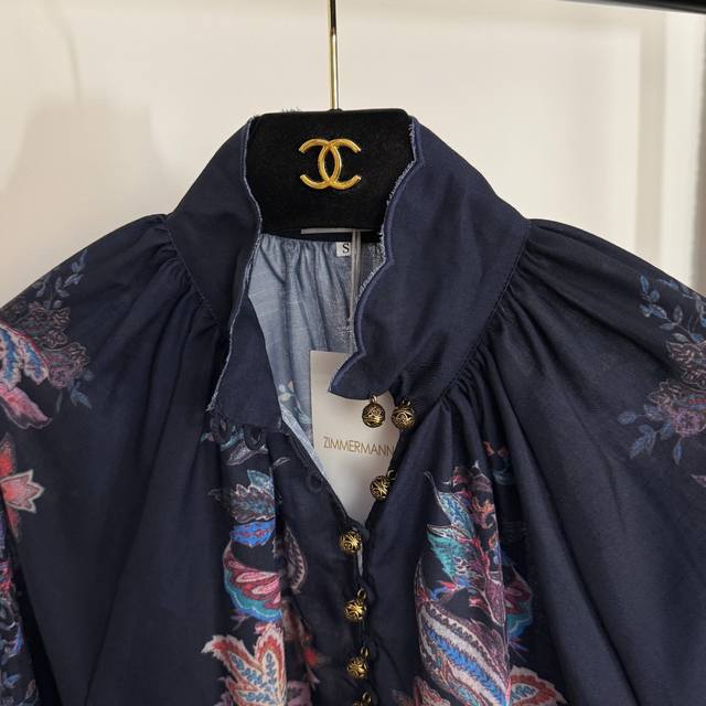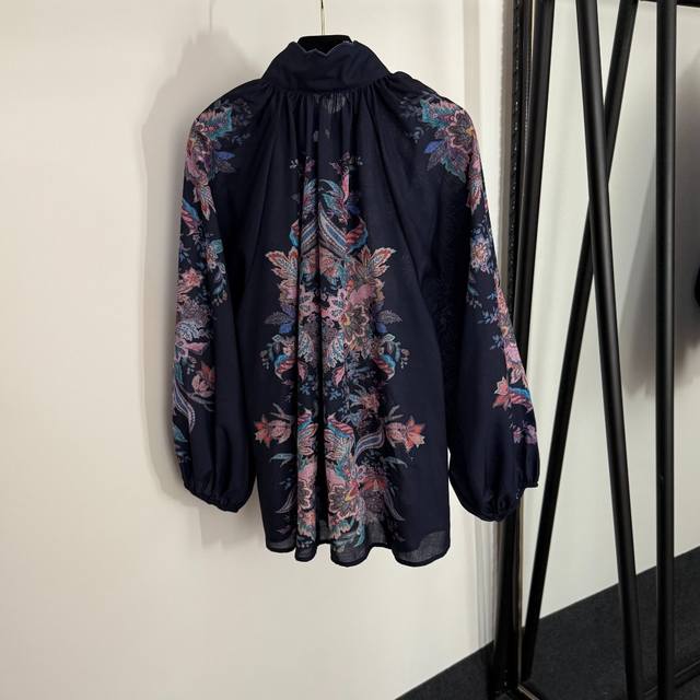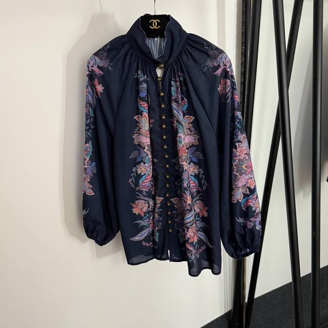 Style No. 20253963 Zimmermann new linen suit, retro colorful flower print hollow button stand collar long-sleeved shirt top + high waist slit skirt, navy blue, S-Xl, S size; bust 120, sleeve length 67, length 67; waist 66 elastic, length 96
