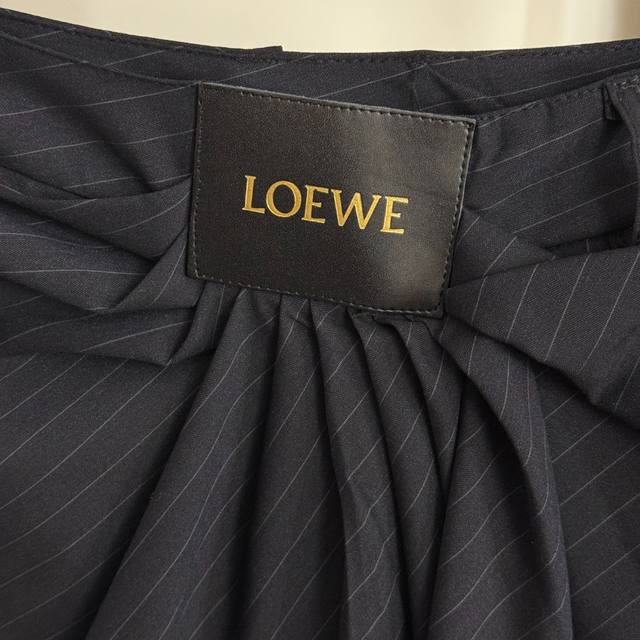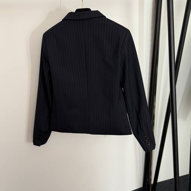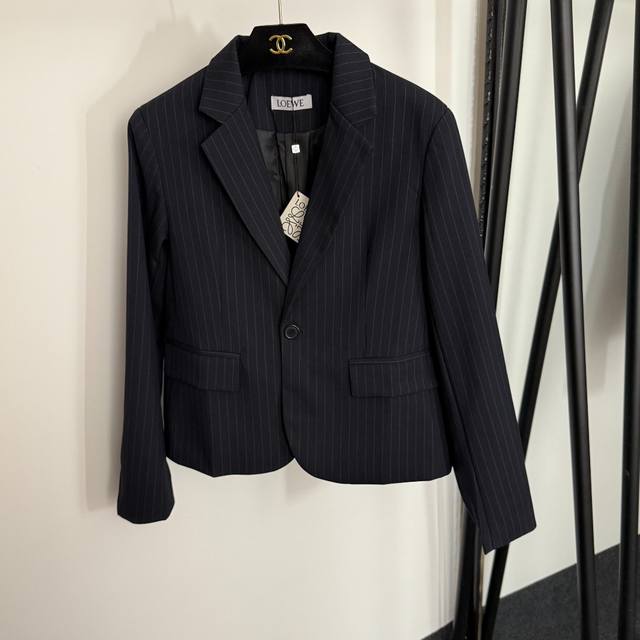 Style No. 20254121 Loew* new Ol suit, one button long sleeve slim striped suit jacket + Logo leather label pleated waist wide leg trousers, blue, Sml, M size; shoulder width 39, chest 92, sleeve length 60, length 57; waist 68, length 109.