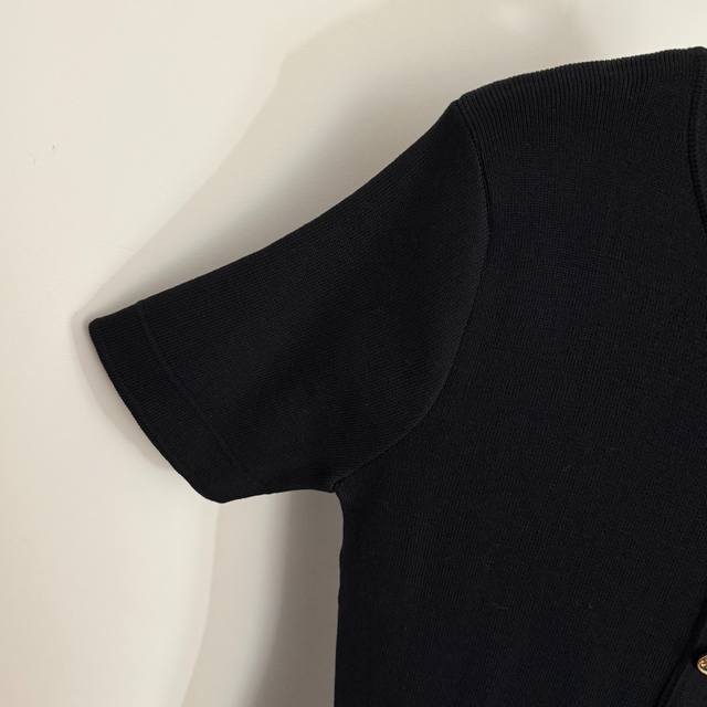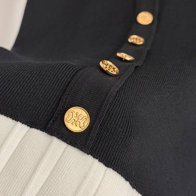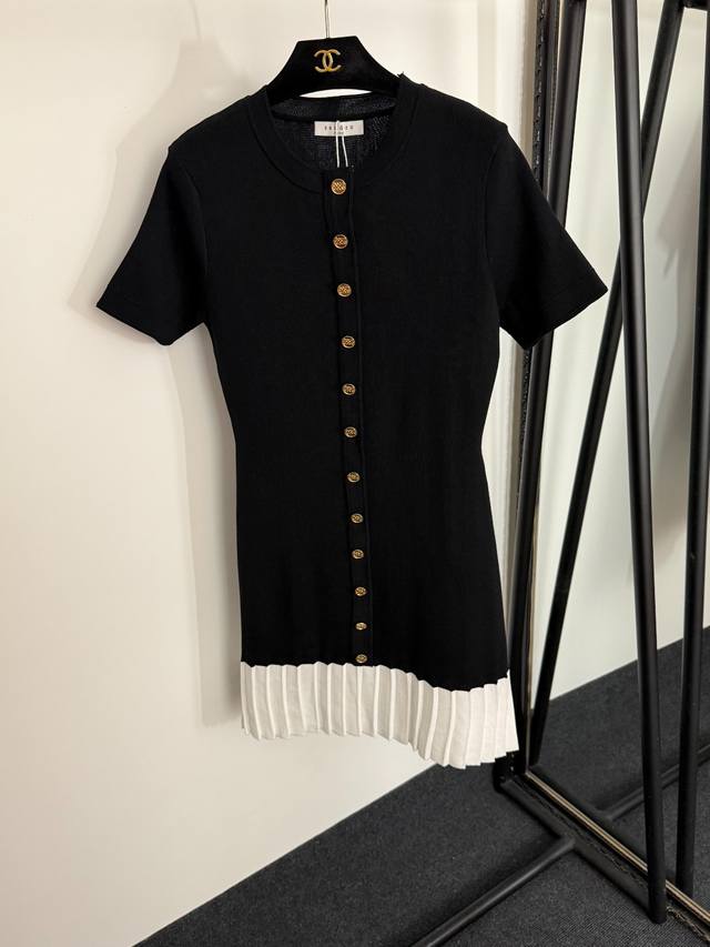 Style No. 20254155 Super running volume Sandr* newest custom gold button hem color matching pleated waist knitted short-sleeved dress, black, one size; shoulder width 37, bust 86, sleeve length 21, length 86.