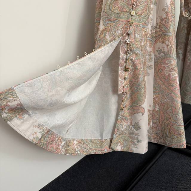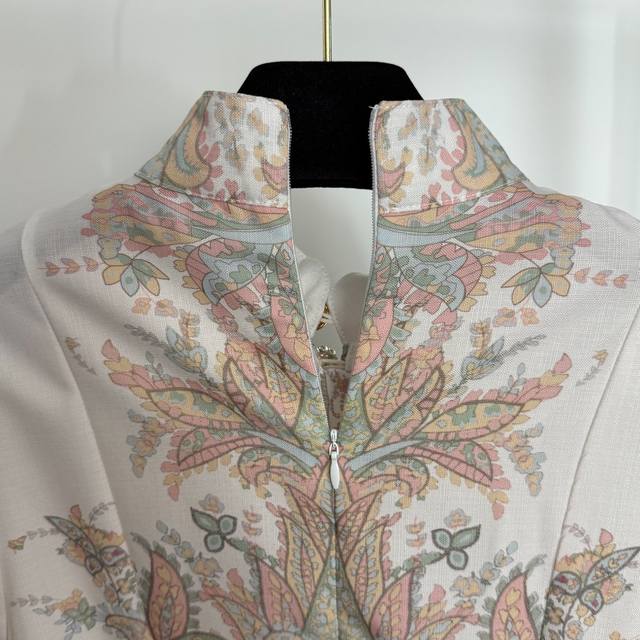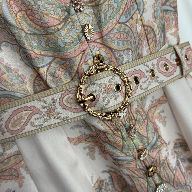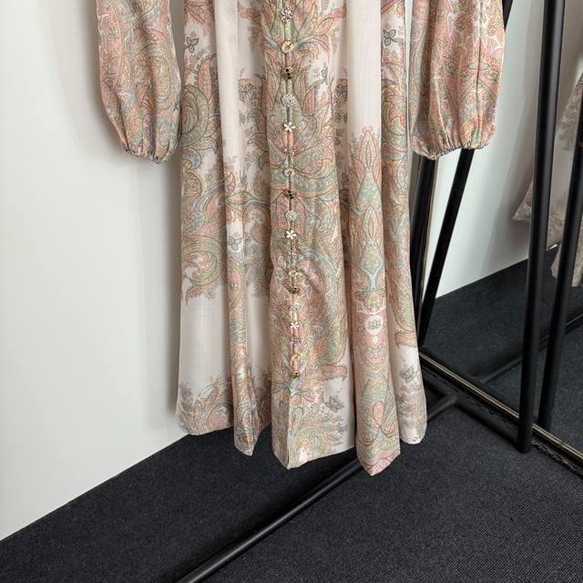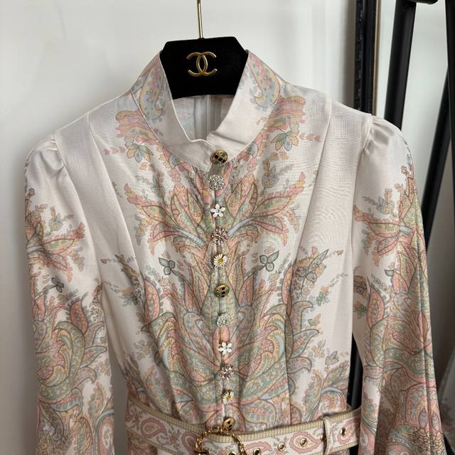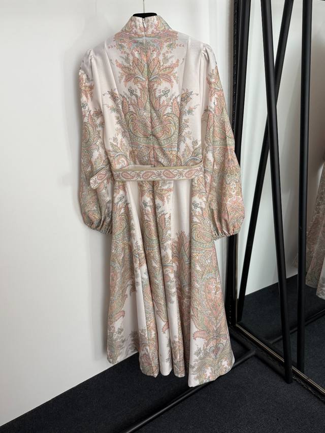 Style No. 20254159 Zimmermann new style multi-button retro pattern print stand collar waist lantern long sleeve dress long skirt, with belt, off-white, S-Xl, M size; bust 90, waist 74, sleeve length 60, total length 121.