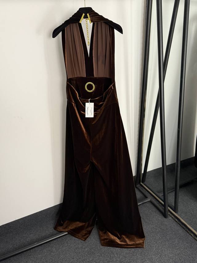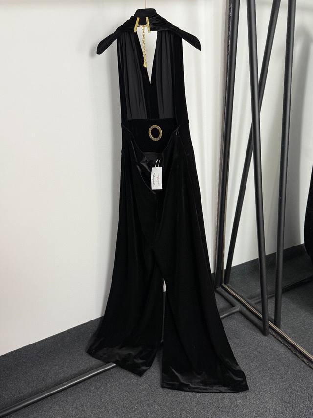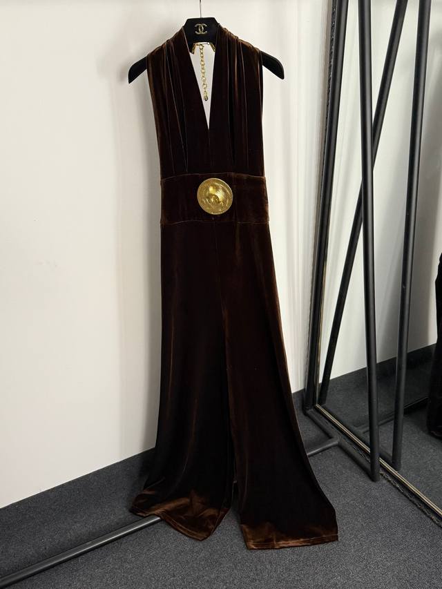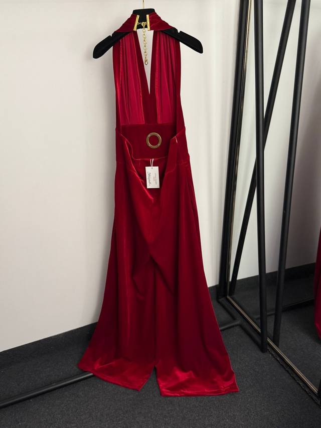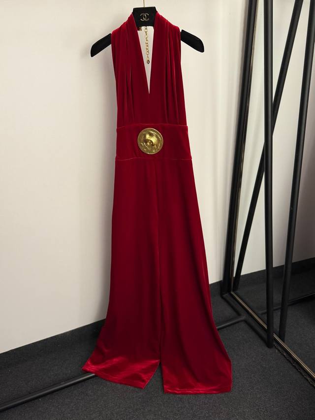 Style No. 20254832 Schiaparelli's latest gold shield metal embellishment halterneck, backless, waist-hugging velvet jumpsuit, wide-leg pants, available in black, coffee, and red. Sizes S-Xl, M; waist 84cm, total length 159cm, weight: 1.115kg.