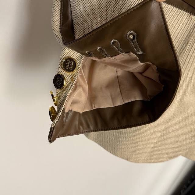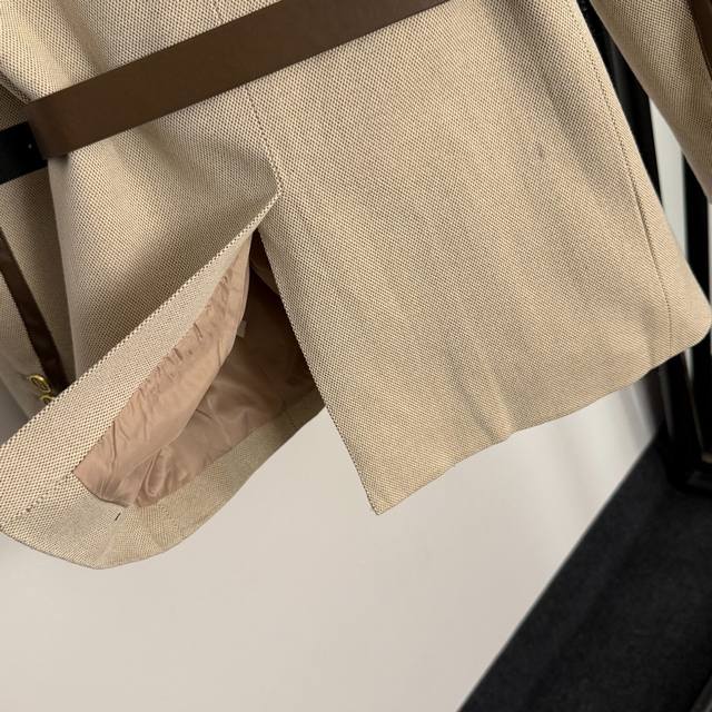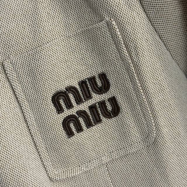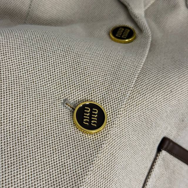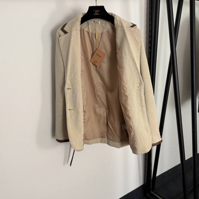 Style No. 20255015 Miumi* new logo embroidered patch pockets and leather lapel long-sleeved suit jacket with a belt, apricot color, Sml, M size: shoulder width 40, chest 104, sleeve length 60, length 69; weight: 0.865kg; with shoulder pads.