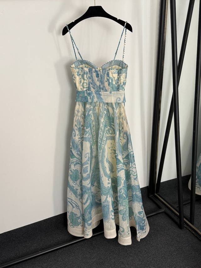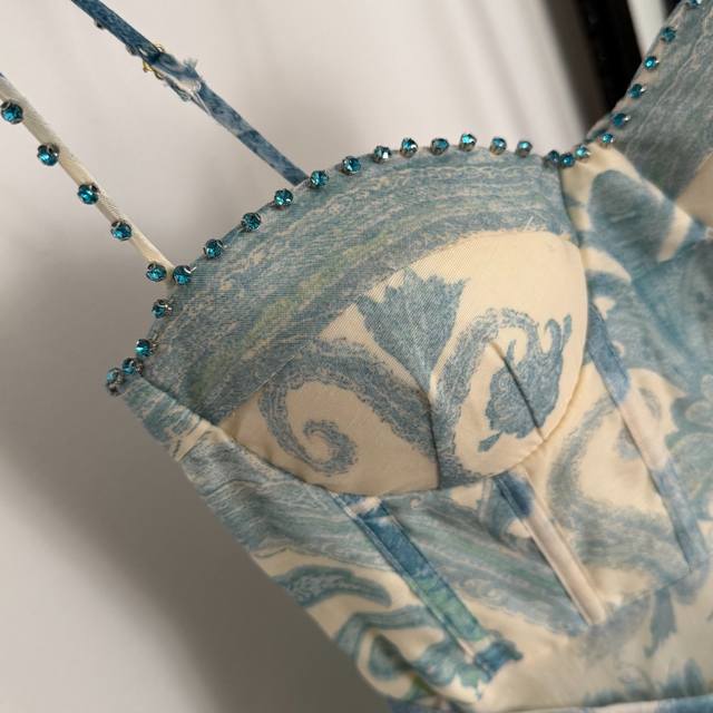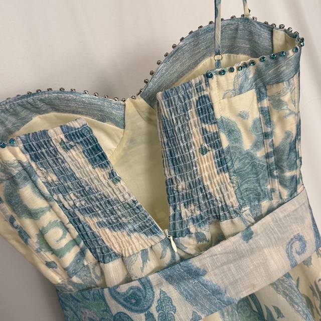 Style No. 20255169 Zimmermann's new retro floral print, beaded hem, strapless, waist-length, wide-leg slip dress, blue, sizes S-XL, S; bust 74cm stretch, waist 64cm stretch, length 117cm; weight: 0.505kg.