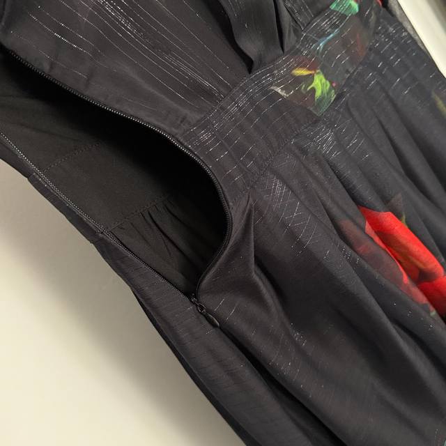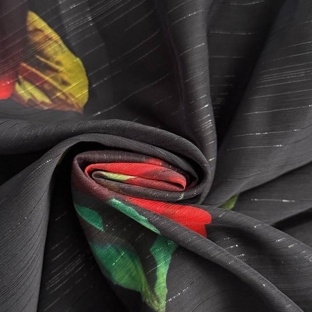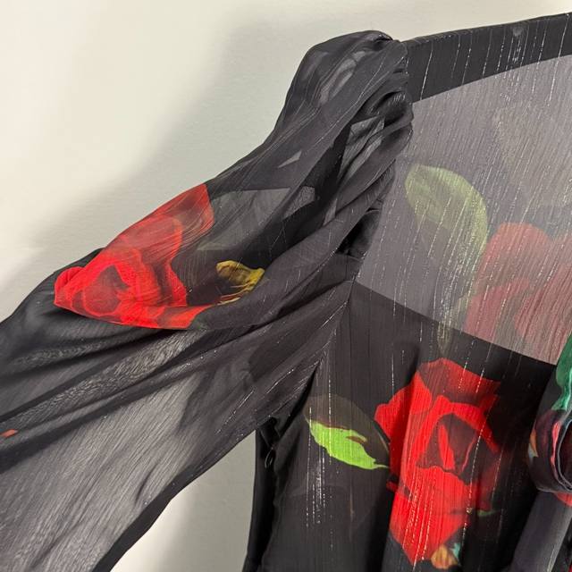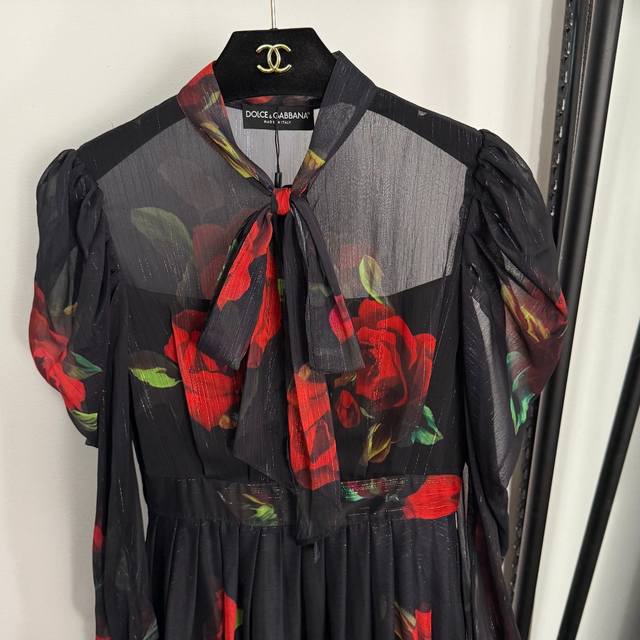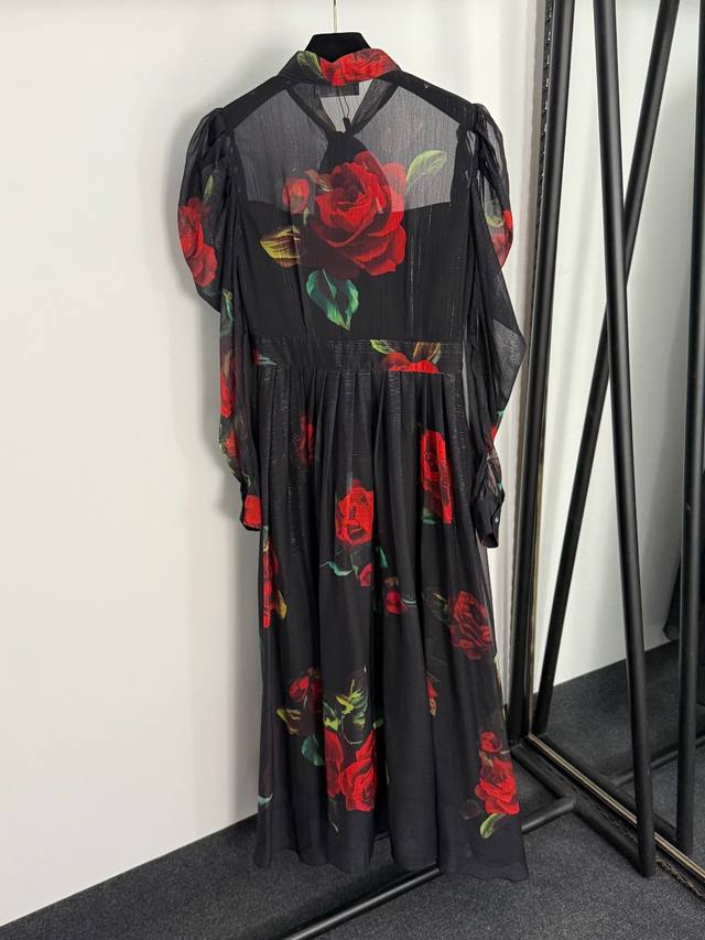 Style No. 20255261 Dg* New red rose print elegant bow collar bubble long sleeve dress, black, S-Xl, S size; shoulder width 36, chest 84, waist 70, sleeve length 62, length 132; weight: 0.395Kg.