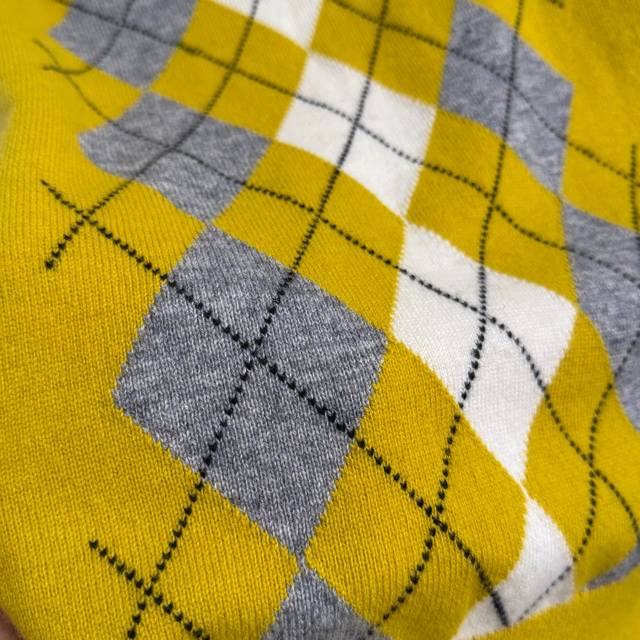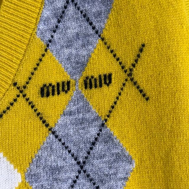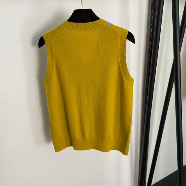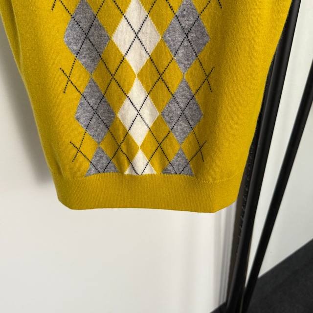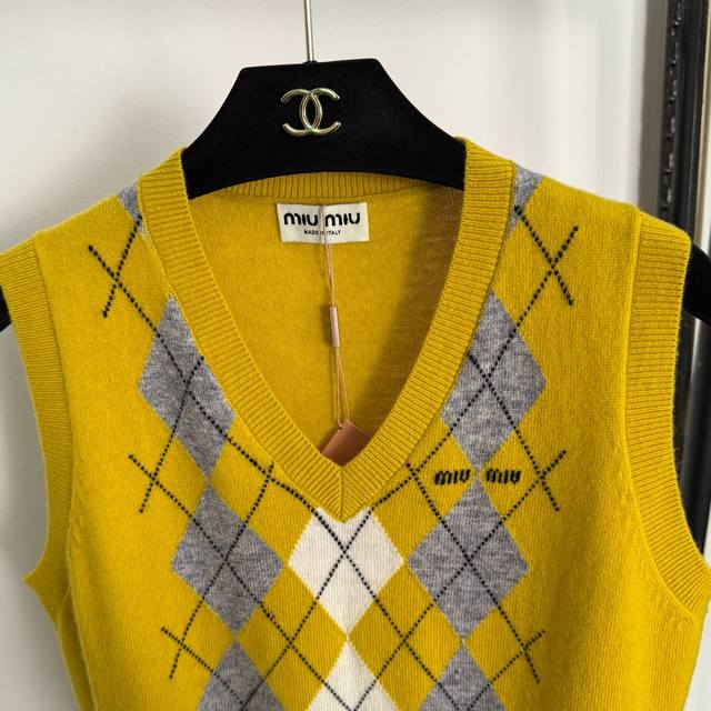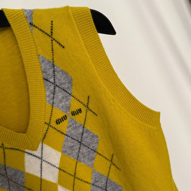 Style No. 20255300 Miumi* new contrast color diamond lattice V-neck wool knit vest, yellow, Sml, M size; chest 90, length 56; weight: 0.145Kg.