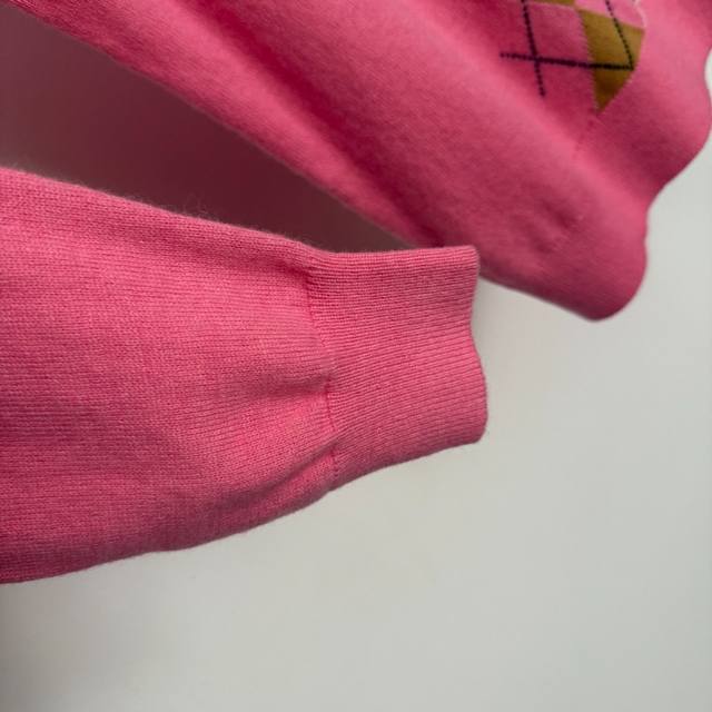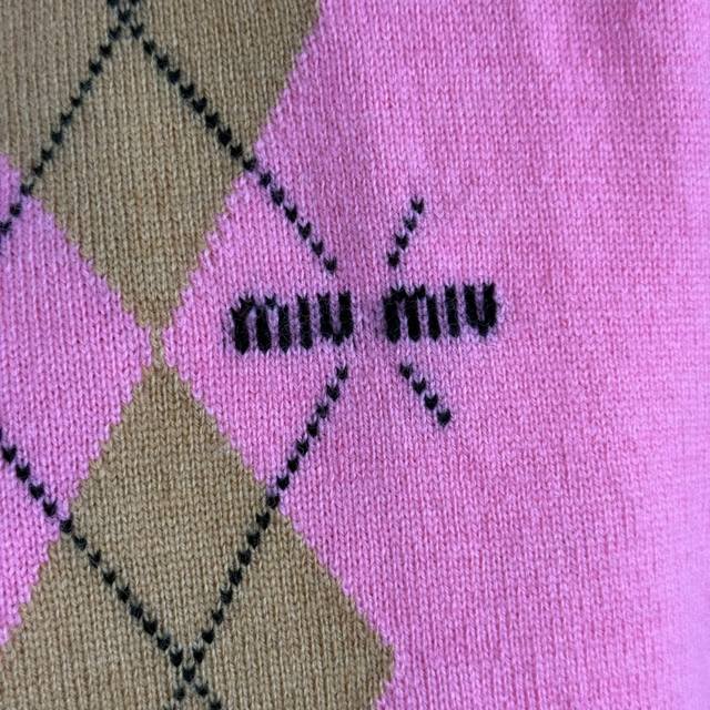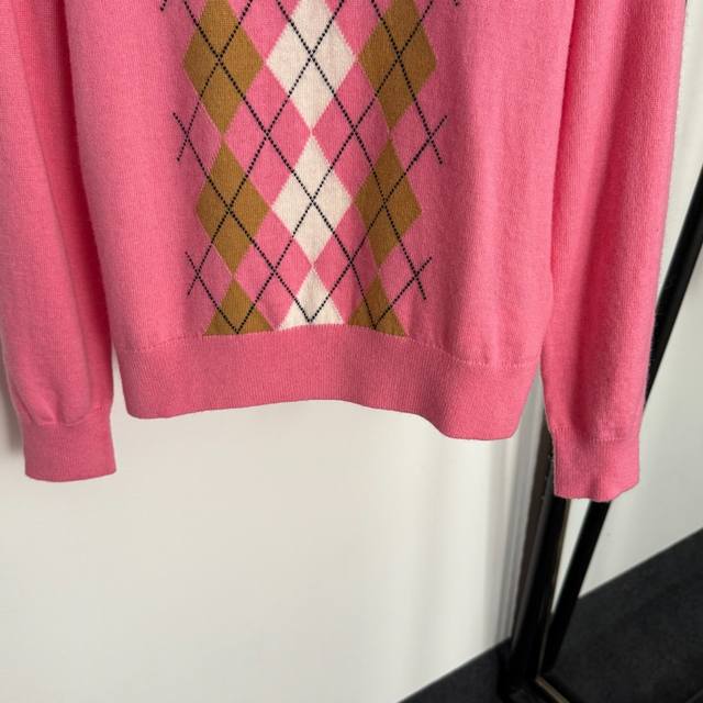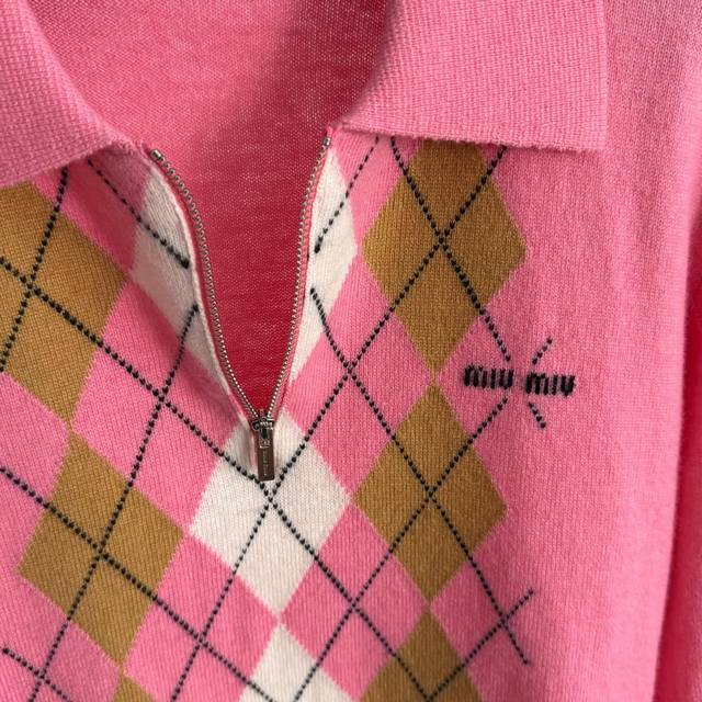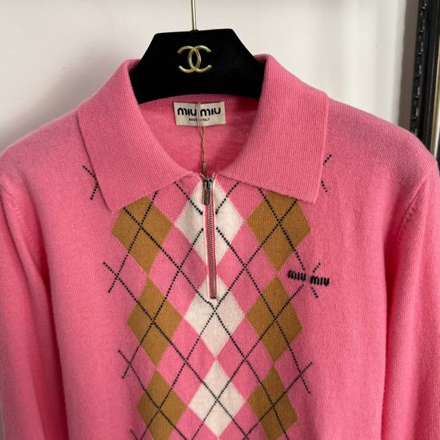 Style No. 20255308 Miumi* new contrast color diamond plaid zipper lapel long-sleeved wool sweater top, pink, Sml, M size; shoulder width 39, chest 98, sleeve length 59, length 56; weight: 0.275Kg.