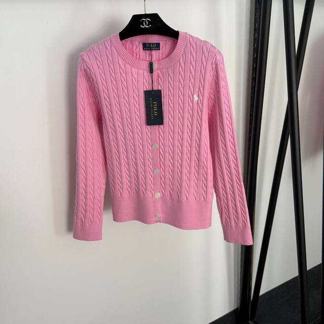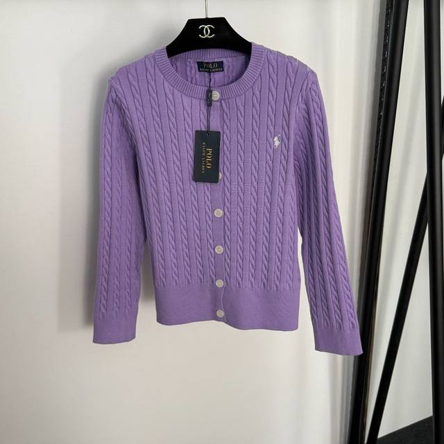 Style No. 20255352 Polo Ralph Lauren new polo embroidered cable-striped round-neck long-sleeved knitted cardigan, available in gray, pink, purple, and blue, Sml, M; shoulder width 36, chest 84, sleeve length 53, length 55; weight: 0.435Kg