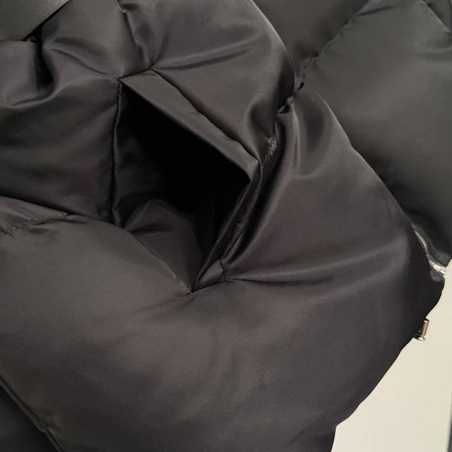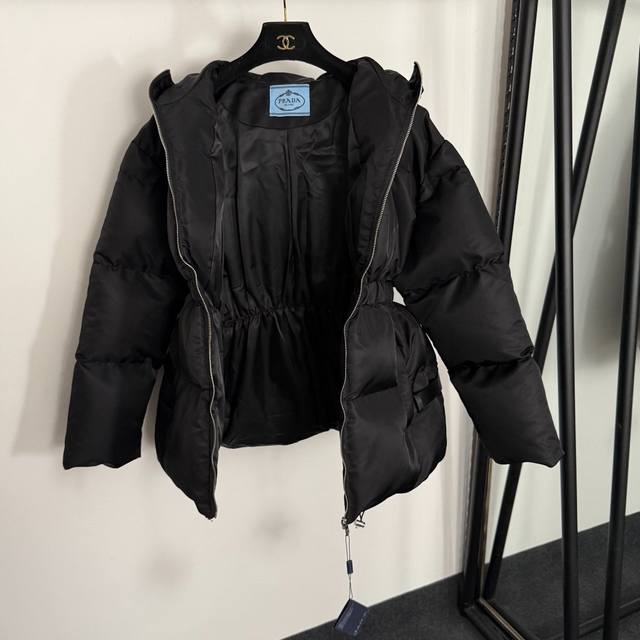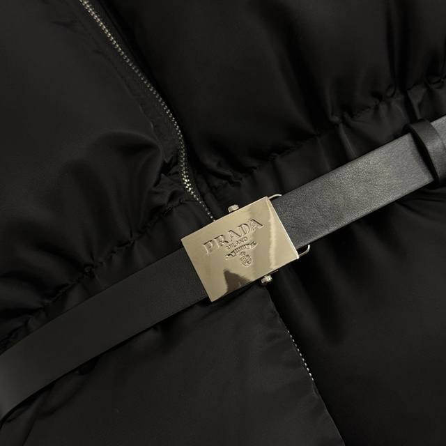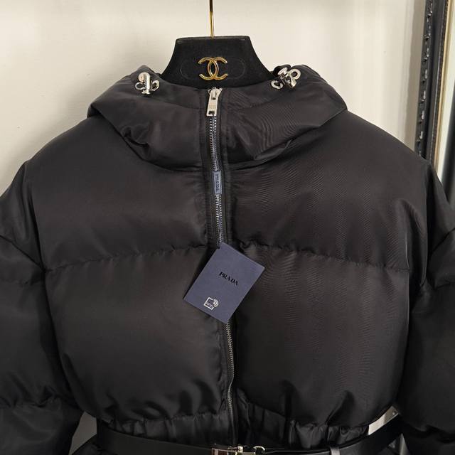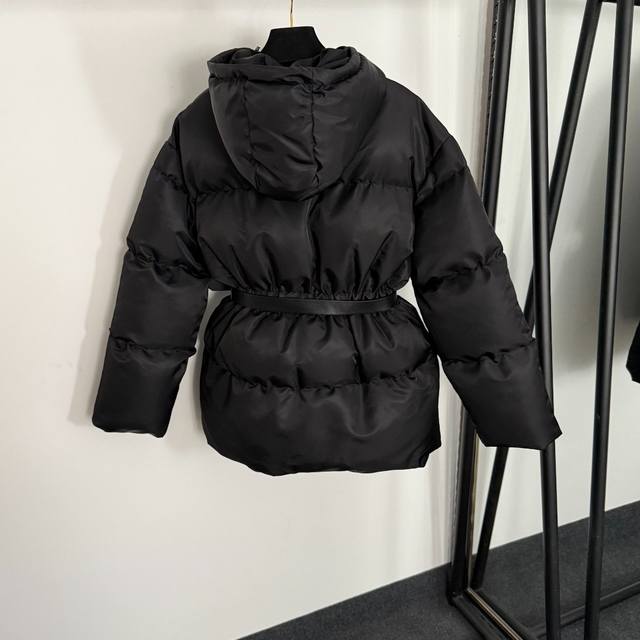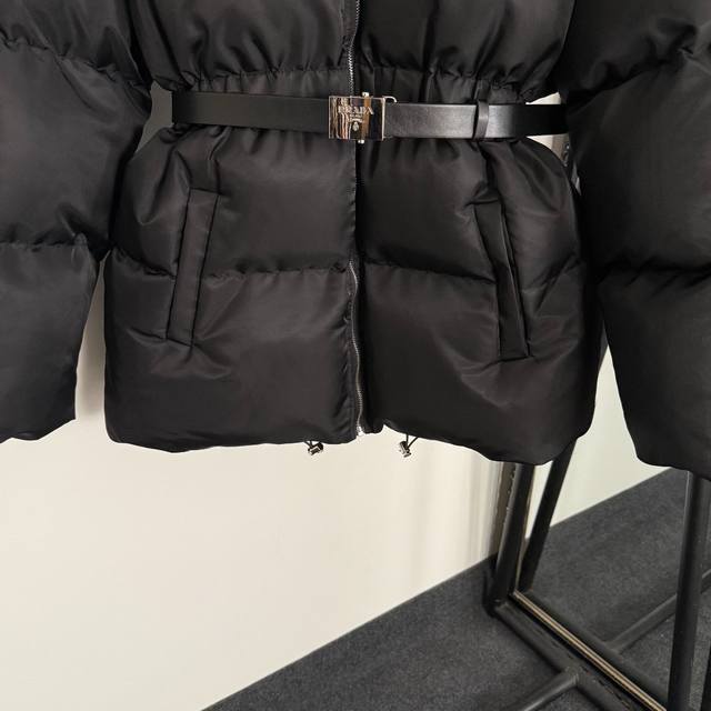Style No. 20255394 prad* Newest custom logo hardware belt waist long-sleeved hooded nylon padded jacket with belt, black, S-1, M; Shoulder 55, Chest 106, Sleeve 58, Length 74; Weight: 1.120 kg.