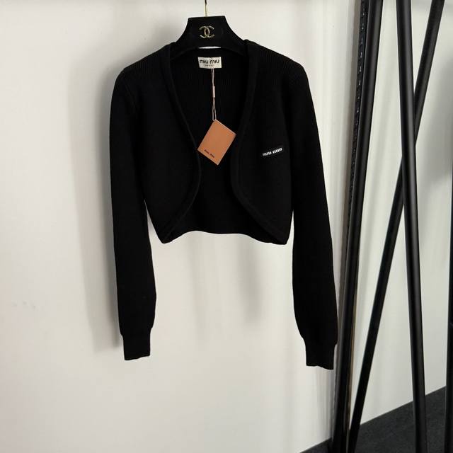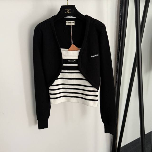 Style No. 20255756 Miumi* new knitted suit, short long-sleeved knitted cardigan with logo collar and striped knitted camisole, black, red, one size fits all; chest 86, sleeve 65, length 40; chest 70, length 49; weight: 0.450Kg
