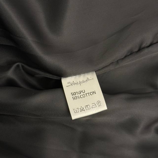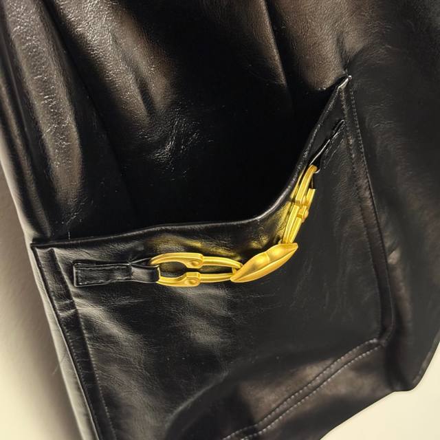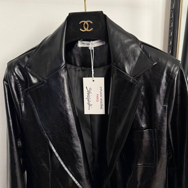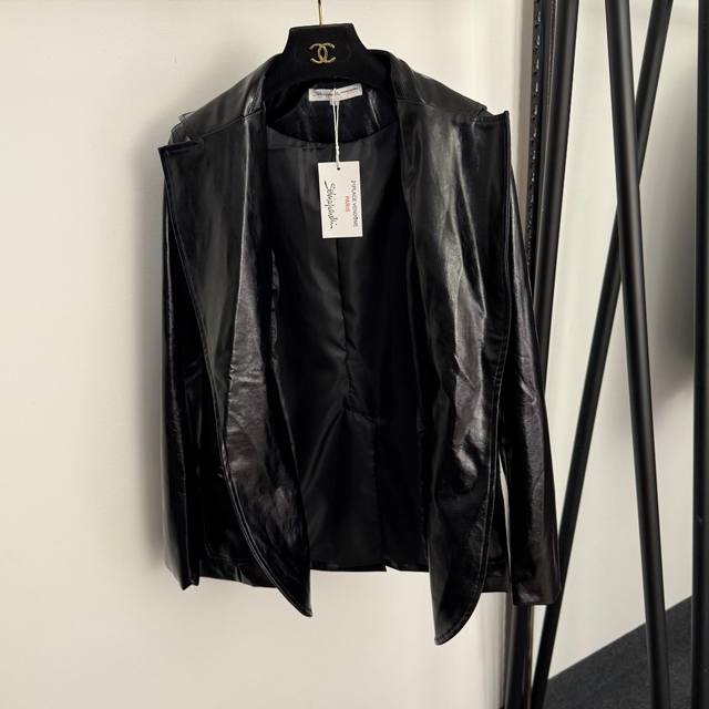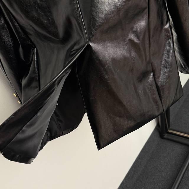 Style No. 20256628 Schiaparelli *New Metal Ear Chain Buckle Eye Lip Chain Double Pocket Long Sleeve Glossy PU Leather Suit Jacket, Black, Sizes S, M, L. M size: Shoulder width 38cm, Chest 98cm, Sleeve length 59cm, Length 68cm; Weight: 0.970kg. DDD