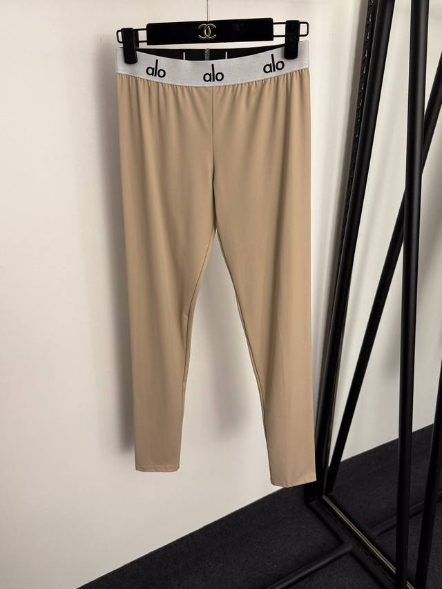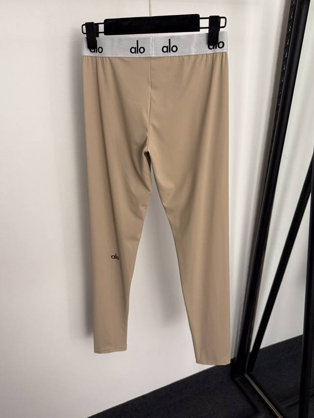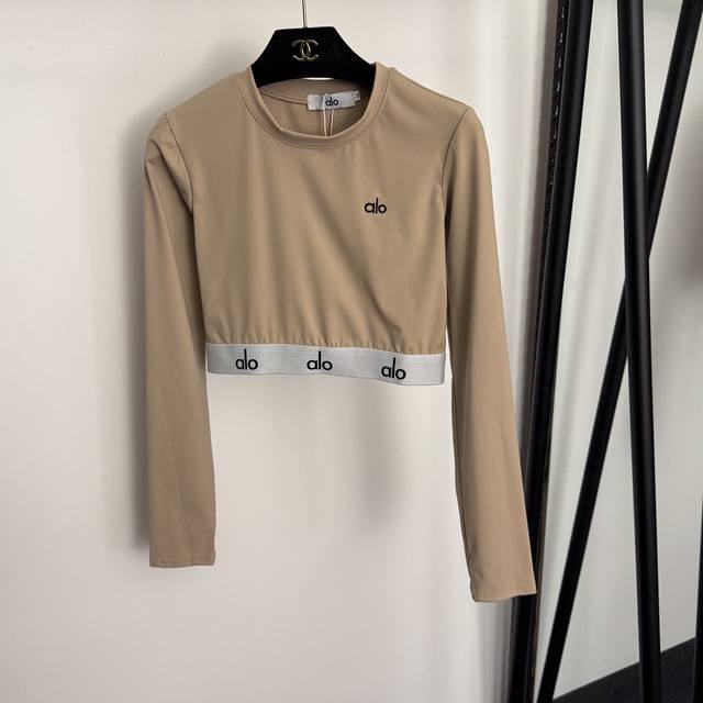 Style No. 20256891 Alo* New Yoga Workout Set, Logo Embroidered Letter Webbing Waist-cinching Short-sleeved Fitted Top + Stretch Slim-fit Leggings, Khaki, Pink, Black, S-XL, M Size: Bust 78, Sleeve Length 61, Length 36; Waist 64 (Stretch), Length 92; Weight: 0.325Kg