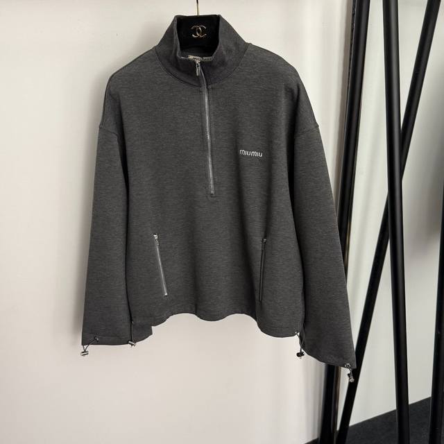 Style No. 20256894 Miumi* New Set: Zippered double pocket, drawstring hem, fitted waist, half-zip stand collar, long-sleeved pullover sweatshirt + high-waisted slit skirt, grey, black, S, M, L. Size M: Shoulder width 53cm, Bust 114cm, Sleeve length 51cm, Length 58cm; Waist 74cm, Length 86cm; Weight: 0.770kg. (