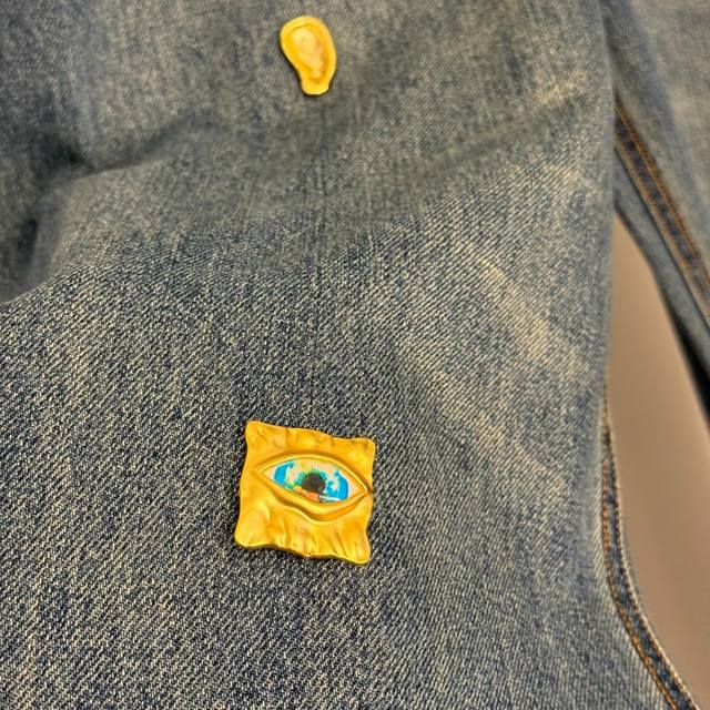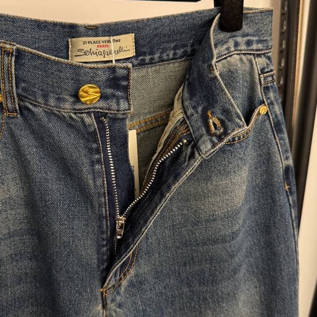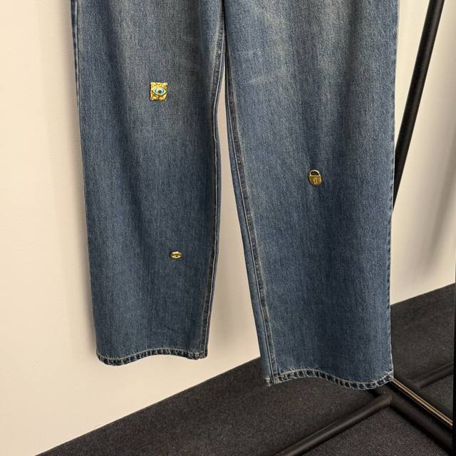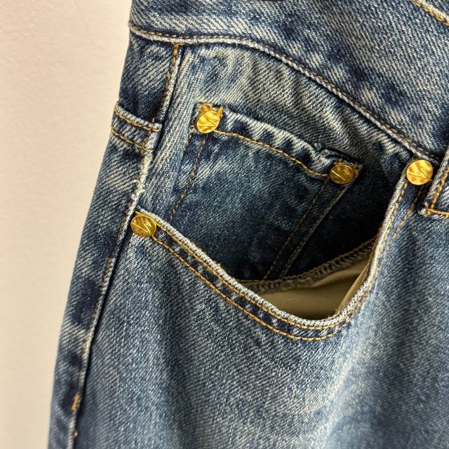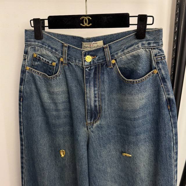 Style No. 20256954 Schiaparelli* New High-End Custom-Made High-Waisted Slimming Jeans with Irregular Gold Button Decoration, Blue, Sizes S, M, L. Size M: Waist 72cm, Length 115cm; Weight: 0.740kg. DDD