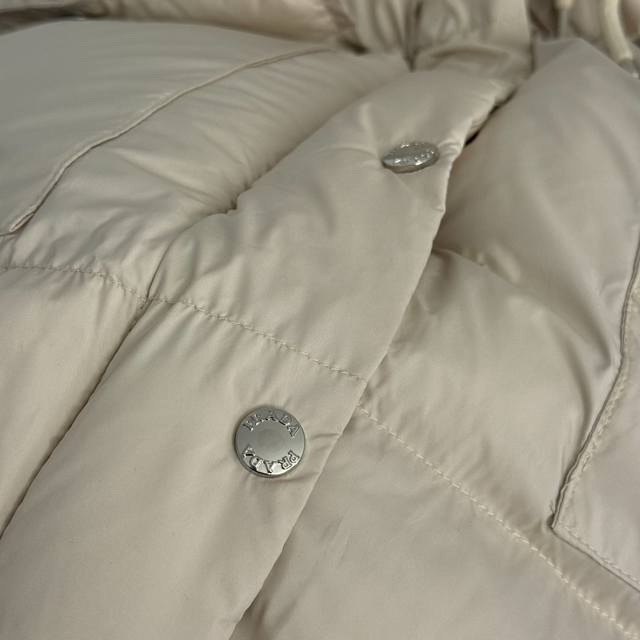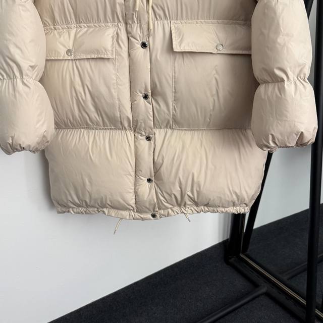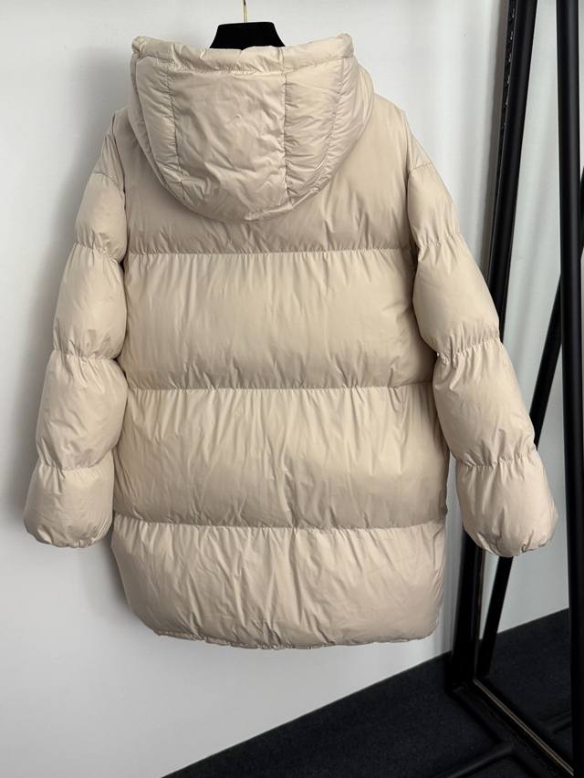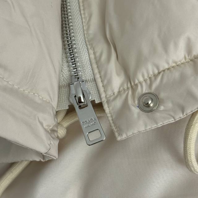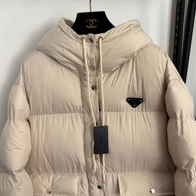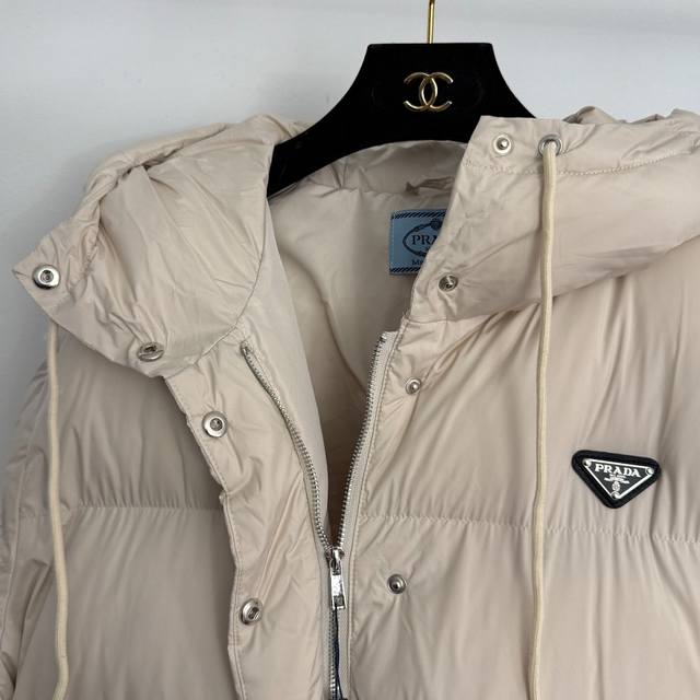Style No. 20257061 prad* New logo triangle-decorated long-sleeved hooded mid-length cotton coat, apricot, brown, black, S, M, L. Size M: Shoulder width 53cm, Chest 134cm, Sleeve length 57cm, Length 90cm; Weight: 2.965kg. DDD