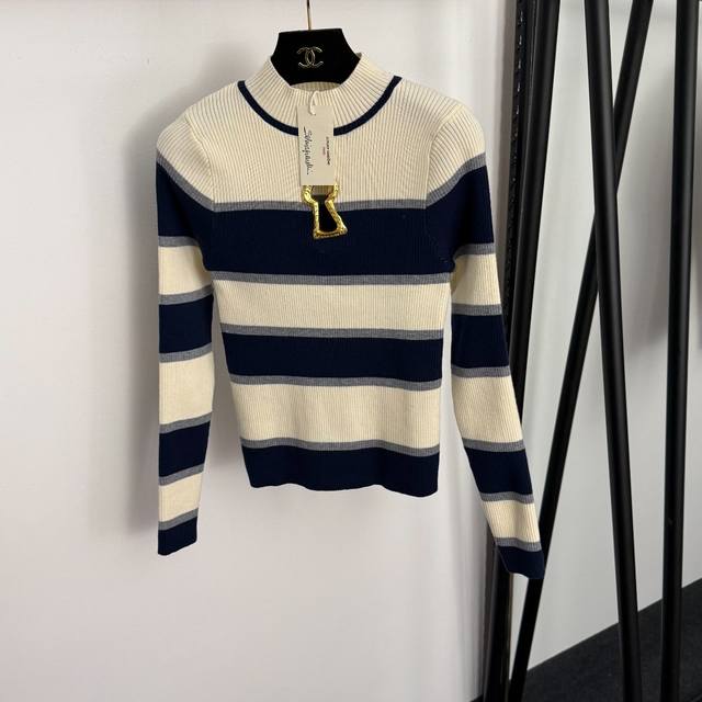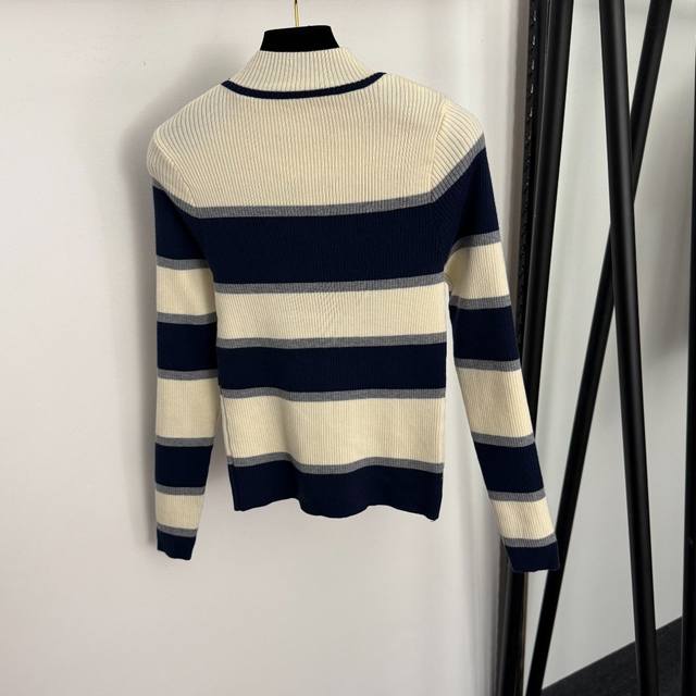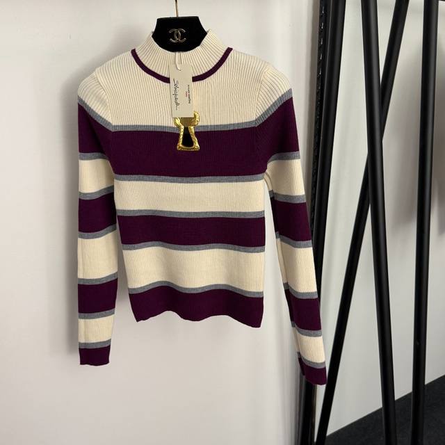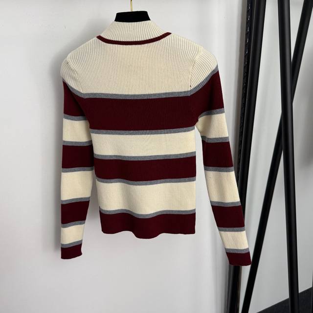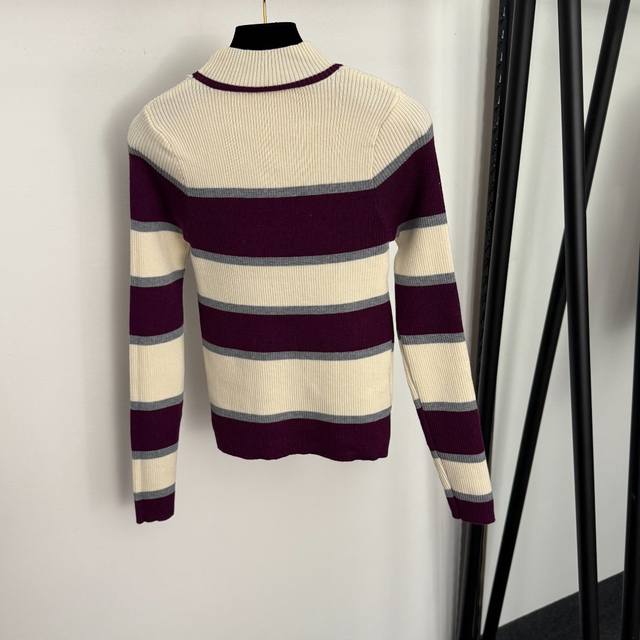Style No. 20257204 Schiaparelli* New hollowed-out metal keyhole decoration color-block striped mock neck long-sleeved knit top, red, navy blue, purple, one size fits all: bust 64, sleeve length 58, length 53; weight: 0.300Kg DDD
