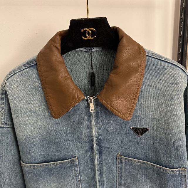 / Style No. 20257656 prad* New PU leather collar short long-sleeved denim jacket,
