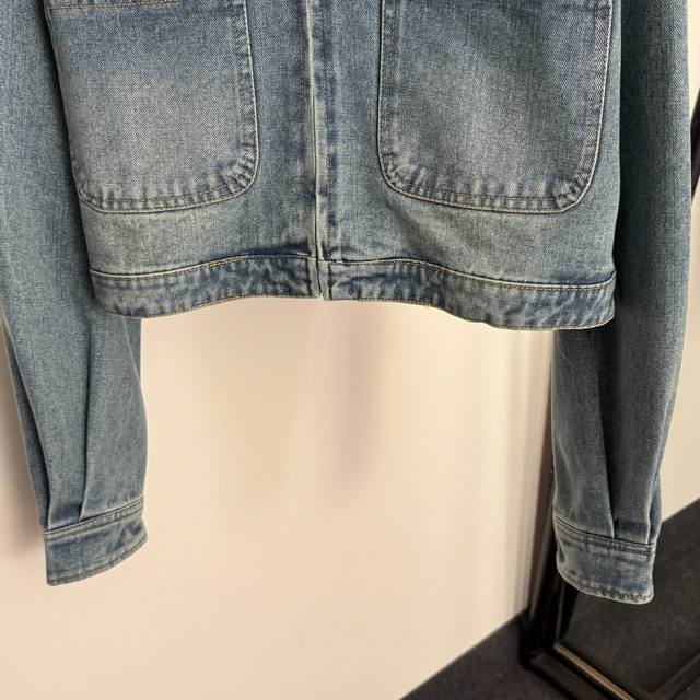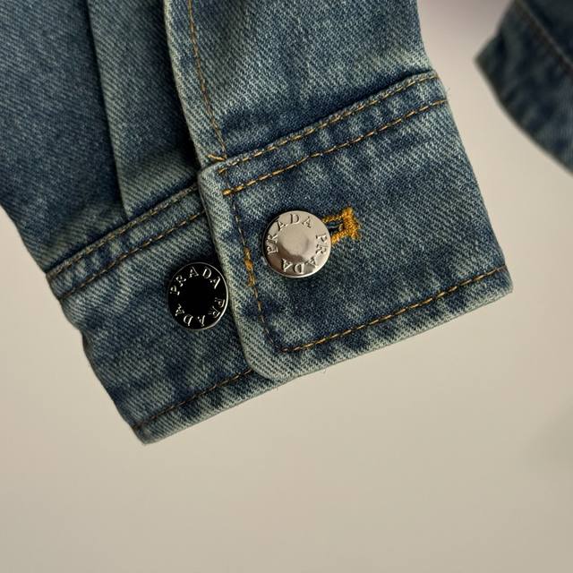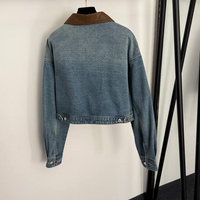 Style No. 20257656 prad* New PU leather collar short long-sleeved denim jacket, blue, S, M, L. Size M: Shoulder width 55cm, Chest 114cm, Sleeve length 57cm, Length 46cm; Weight: 0.720kg. DDD
