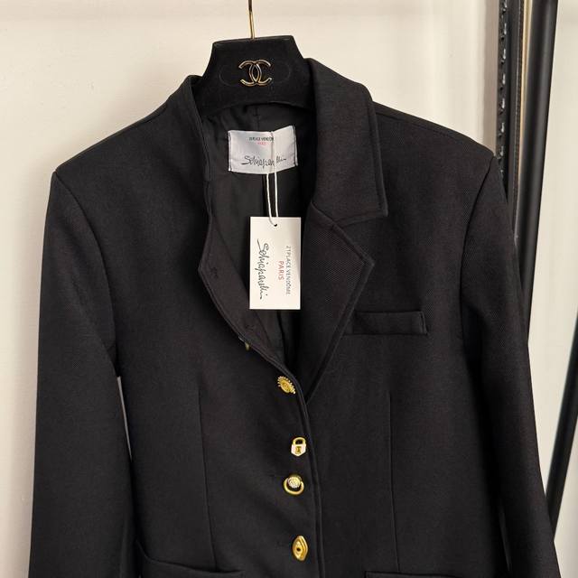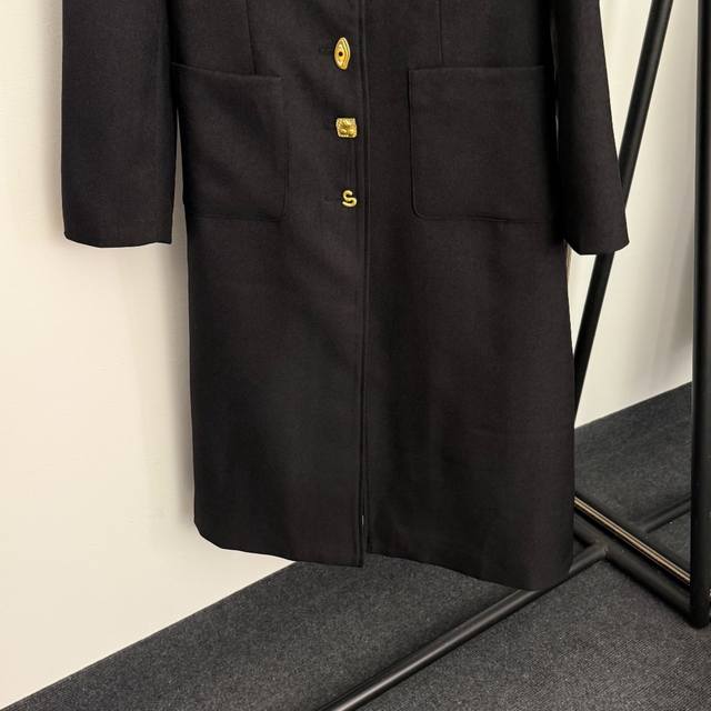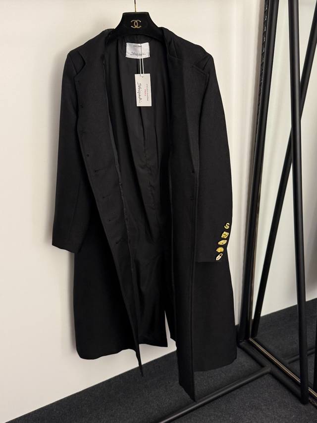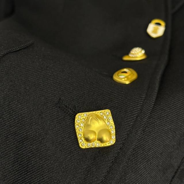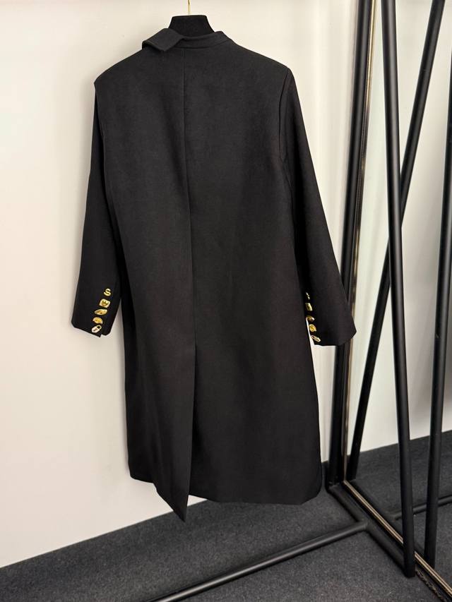 Style No. 20257698 Schiaparelli* New High-End Custom Metallic Irregular Gold Button Long-Sleeved Mid-Length Suit Coat, Black, Sizes S, M, L. M Size: Shoulder Width 42cm, Chest 112cm, Sleeve Length 61cm, Length 113cm; Weight: 0.990kg DDD