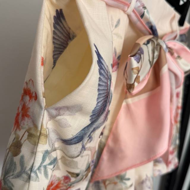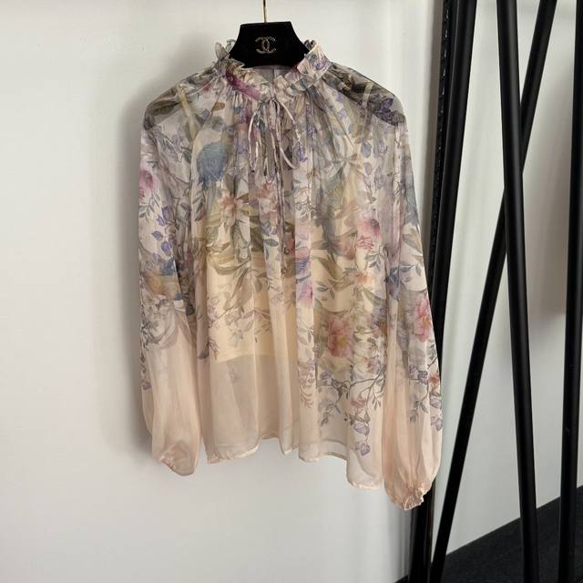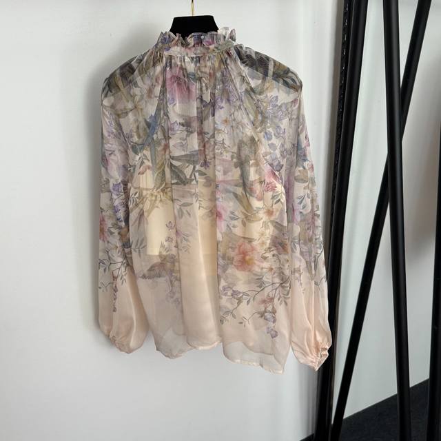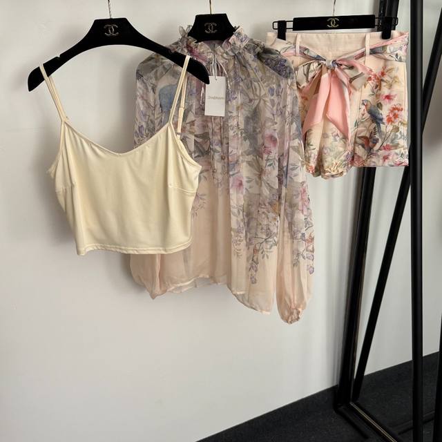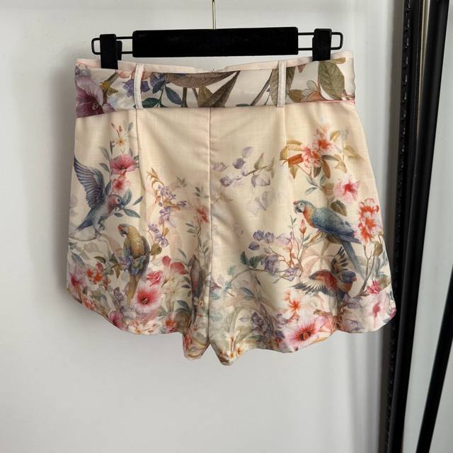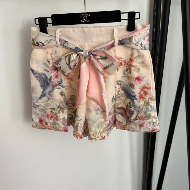 Style No. 20258200 Zimmermann* New Set: Floral and Bird Print Long-Sleeve Shirt with Ruffled Collar + Tie-Waist Shorts, with Camisole Liner, Pink, Sizes S-XL. M Size: Bust 88cm, Length 30cm; Bust 130cm, Sleeve Length 69cm, Length 63cm; Waist 70cm, Length 37cm; Weight: 0.305kg DDD
