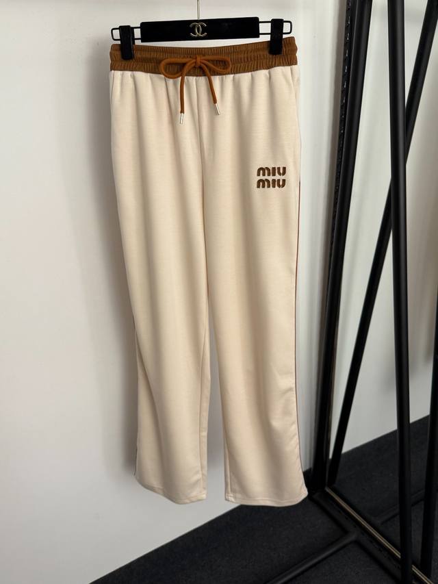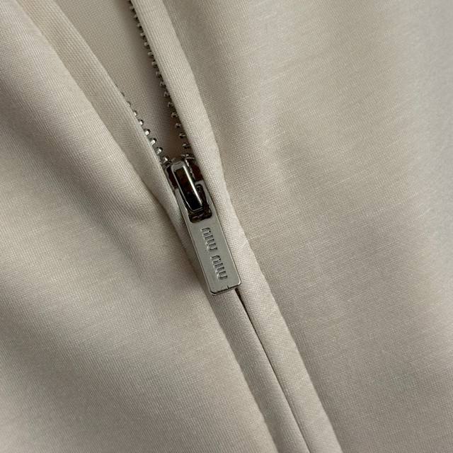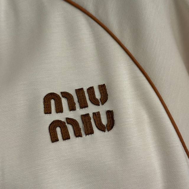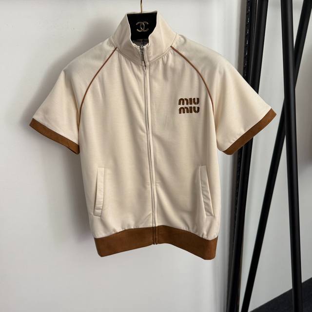 Style No. 20258278 Miumi* New Tracksuit: Stand Collar Short-Sleeve Zipper Jacket with Embroidered Logo Applique on Chest + Elastic Waist Casual Pants, Apricot, Black, Blue, Sizes S-XL. Size M: Chest 102cm, Sleeve Length 30cm, Length 56cm; Waist 64cm (elastic), Length 102cm; Weight: 0.670kg. DDD