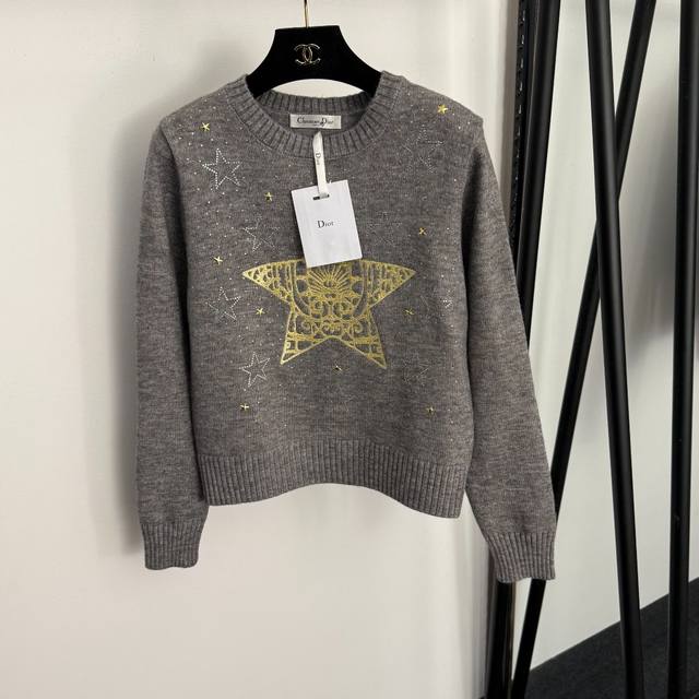 Style No. 20258309 Dio* New Rhinestone Five-Pointed Star Embroidered Pullover Long-Sleeve Knit Sweater, Off-White, Red, Gray, Blue, One Size: Shoulder Width 38cm, Bust 92cm, Sleeve Length 61cm, Length 56cm; Weight: 0.330Kg DDD
