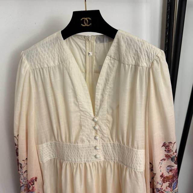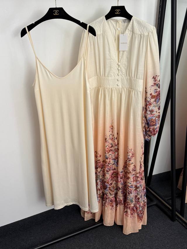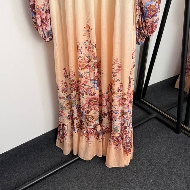 Style No. 20258397 Zimmermann *New Elegant Floral Print V-Neck Fitted Waist Lantern Sleeve Dress, with Camisole Lining, Apricot Color, Sizes S-XL. M Size: Bust 94cm, Length 96cm; Bust 100cm, Waist 86cm, Sleeve Length 66cm, Length 145cm; Weight : 0.665kg. DDD