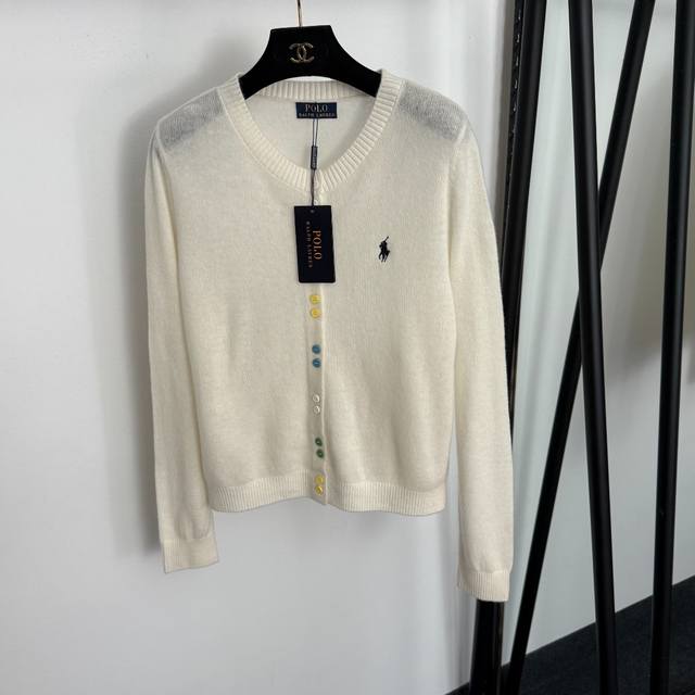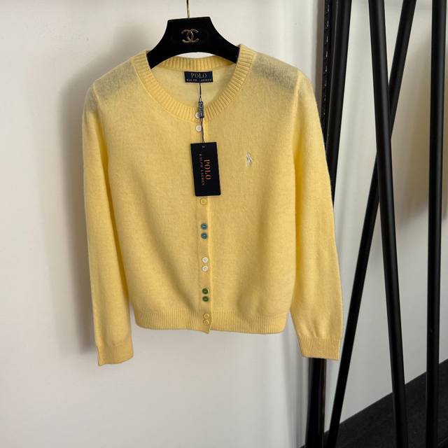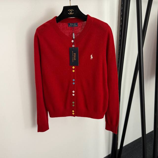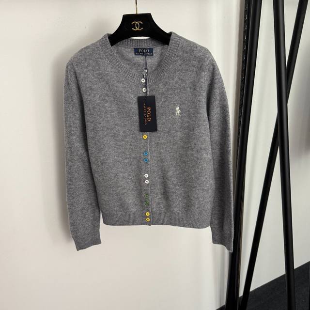 Style No. 20259268 Ralph Lauren New Polo Embroidered Colorful Button Long-Sleeve Wool and Cashmere Knit Cardigan, Grey, White, Pink, Red, Black, Yellow, Sizes S, M, and L. Size M: Shoulder Width 37cm, Chest 96cm, Sleeve Length 59cm, Length 54cm; Weight: 0.165kg. (DDD)