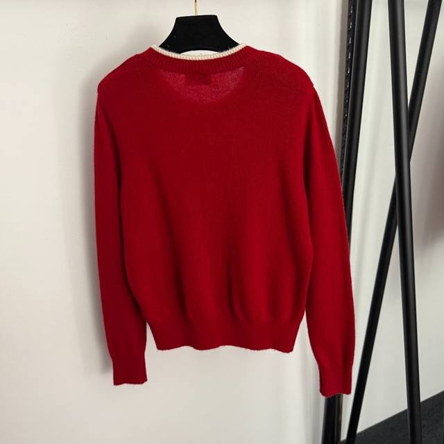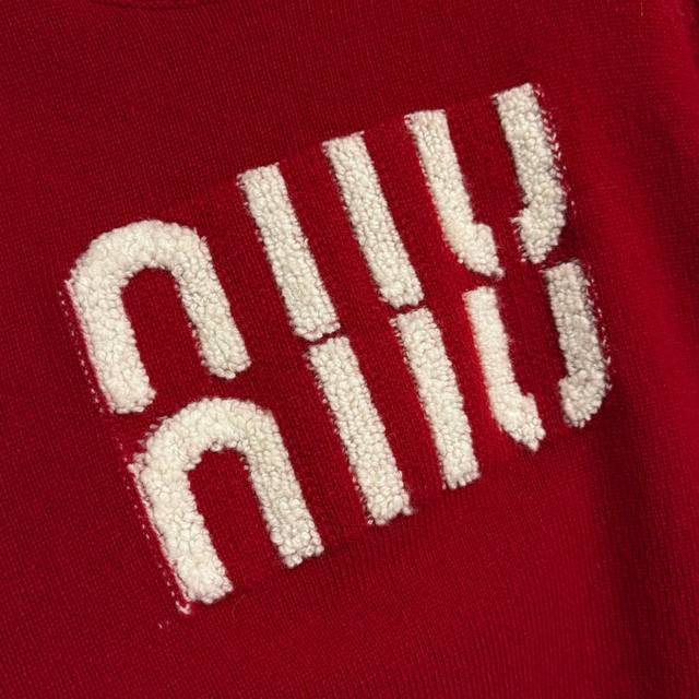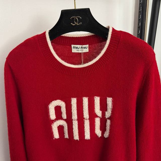 Style No. 20259269 Miumi*New Flocked Logo Jacquard Pullover Long-Sleeve Wool and Cashmere Knit Sweater, Red, Sizes S, M, M: Shoulder Width 38cm, Chest 104cm, Sleeve Length 62cm, Length 58cm; Weight: 0.255kg. DDD