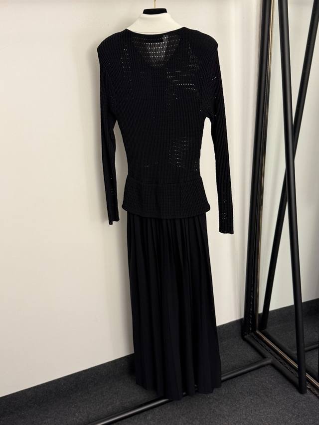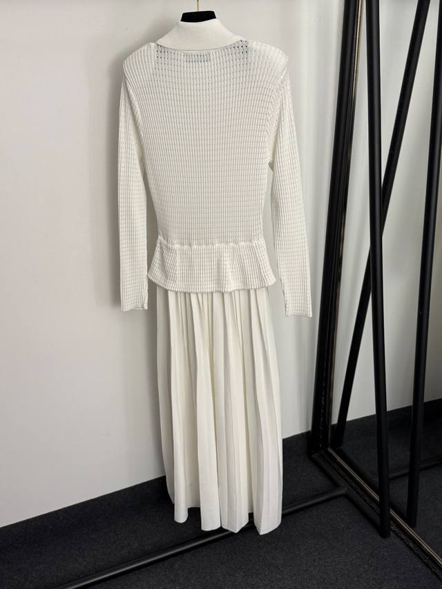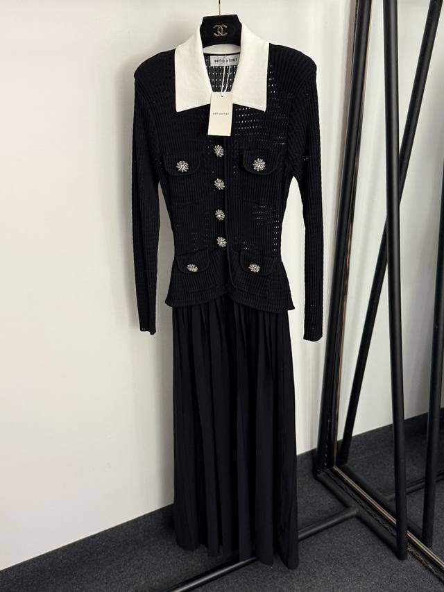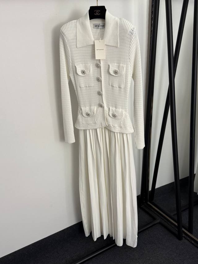 Style No. 20259286 Self Portrai*Sp New Rhinestone Button Ruffled Waist Collar Long Sleeve Knitted Pleated Dress, with Shoulder Pads, White, Burgundy, Black, S-XL, Size M: Bust 78cm, Sleeve Length 61cm, Length 131cm; Weight: 1.270kg. DDD
