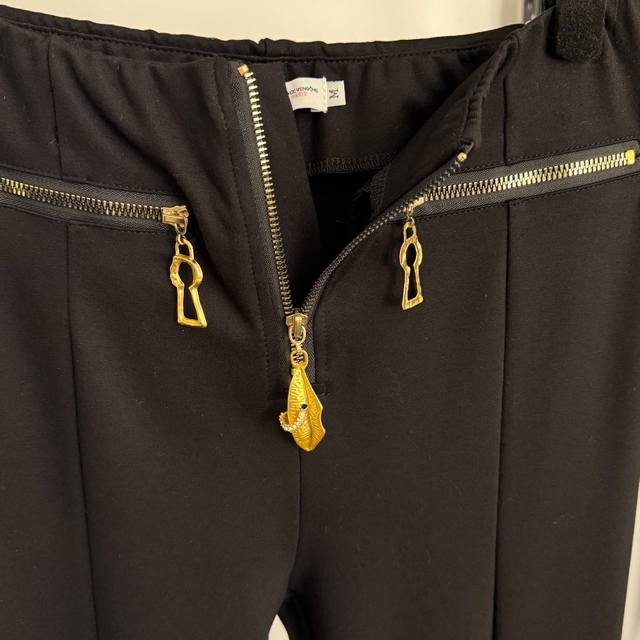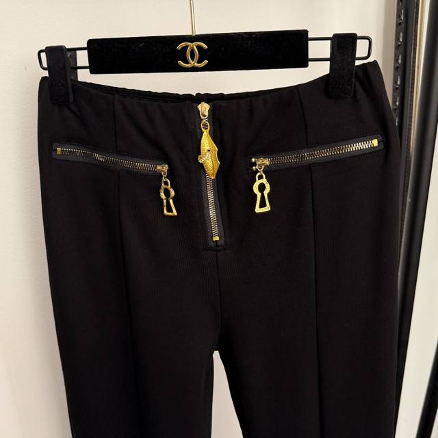 Style No. 20259295 Schiaparelli *New Metal Lip Zipper Keyhole Double Pocket High-Waisted Slimming Flared Trousers, Black, Sizes S, M, L. M: Waist 62 (elastic), Length 103; Weight: 0.415Kg DDD