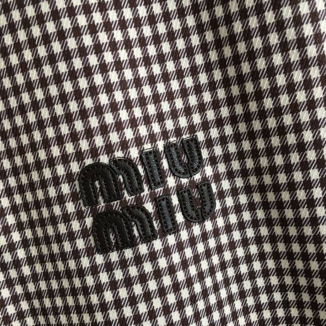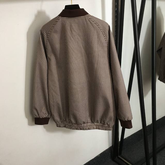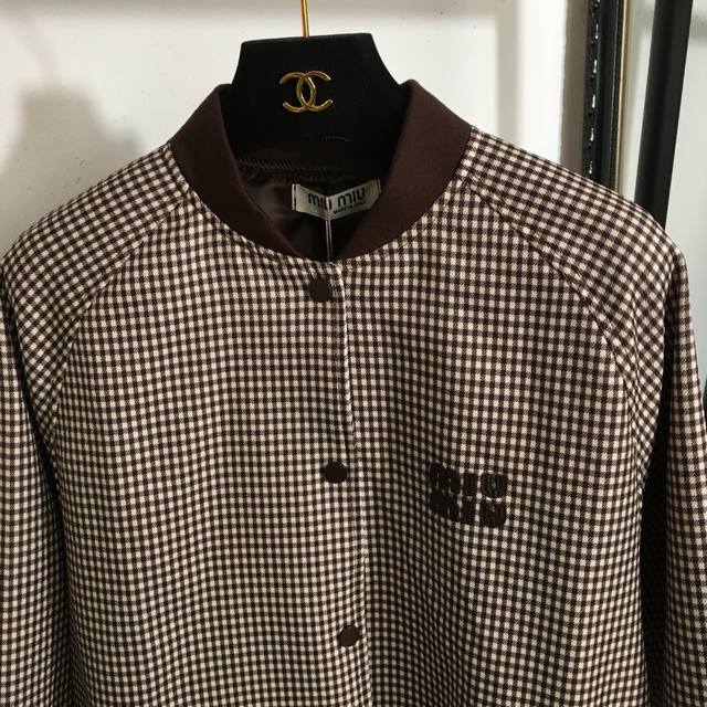 Style No. 6633 Miumi* new suit, leather label letter embroidered patch retro plaid long-sleeved jacket + A-line pleated short skirt, brown, Sml, M size; bust 116, sleeve length 73, length 71; waist 76, length 36.
